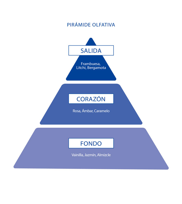Seine Kopfnoten haben Anklänge von roten Früchten wie Himbeere und einem Hauch Bergamotte, die in ein Herz aus Rosen-, Ambra- und Karamellnoten verschmelzen und allmählich an Nachhaltigkeit gewinnen, ein Hintergrund mit Noten von Vanille, Jasmin und Moschus.