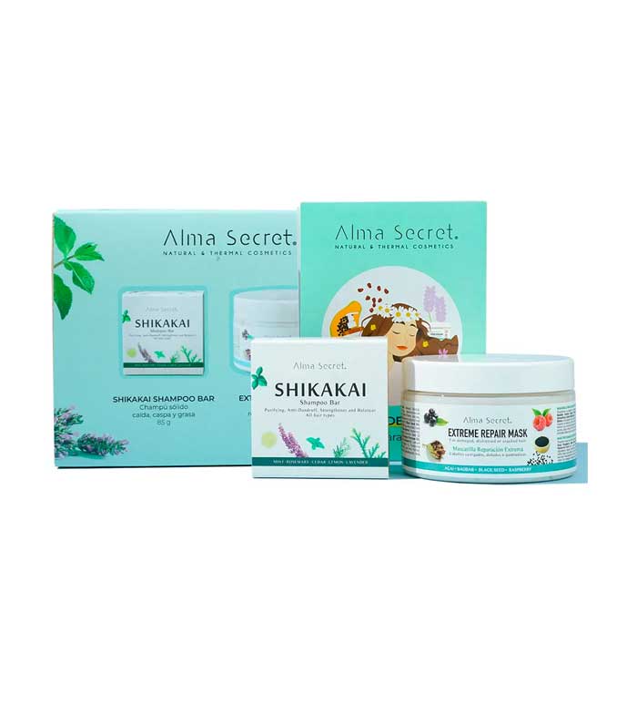 Das Geschenkpaket Alma Secret ist perfekt für großartiges Haar und besteht aus dem festen Anti-Haarausfall-Shampoo Shikakai und der Maske Extreme Repair..