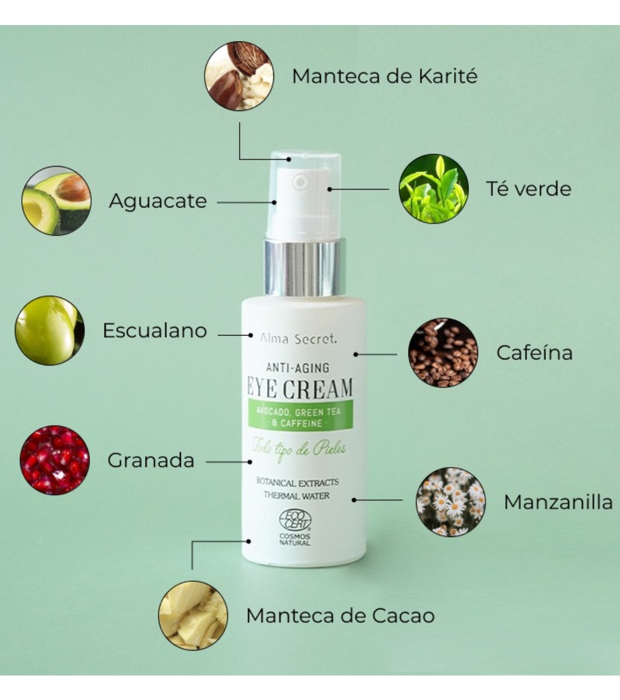 Die Multi-Repairing- und Anti-Aging-Augenkonturcreme mit Avocado, Grüntee und Koffein von Alma Secret verfügt über eine kraftvolle, natürliche Formel zur Bekämpfung von Alterserscheinungen und Müdigkeit im Augenbereich.
