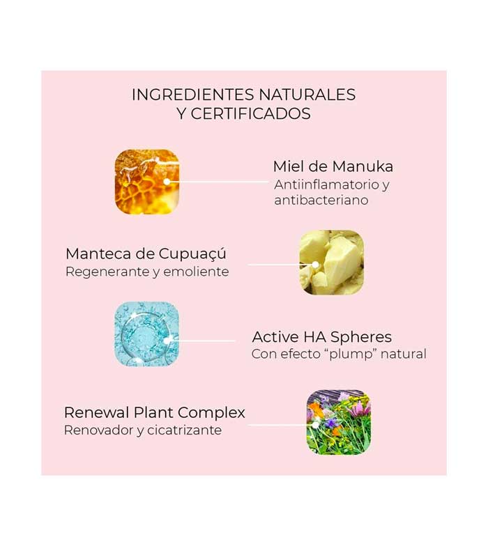 Die Formulierung besteht aus einer kraftvollen Kombination aus Manuka-Honig und aktiven HA-Kugeln, einem innovativen Wirkstoff mit natürlicher Technologie, der aus aufpolsternden Mikrokügelchen aus Hyaluronsäure mit niedrigem Molekulargewicht besteht, die die Hautfeuchtigkeit vervielfachen und die Lippen leicht aufpolstern.