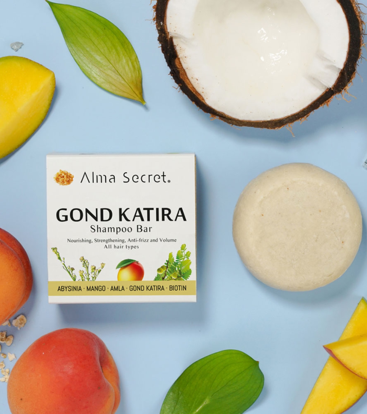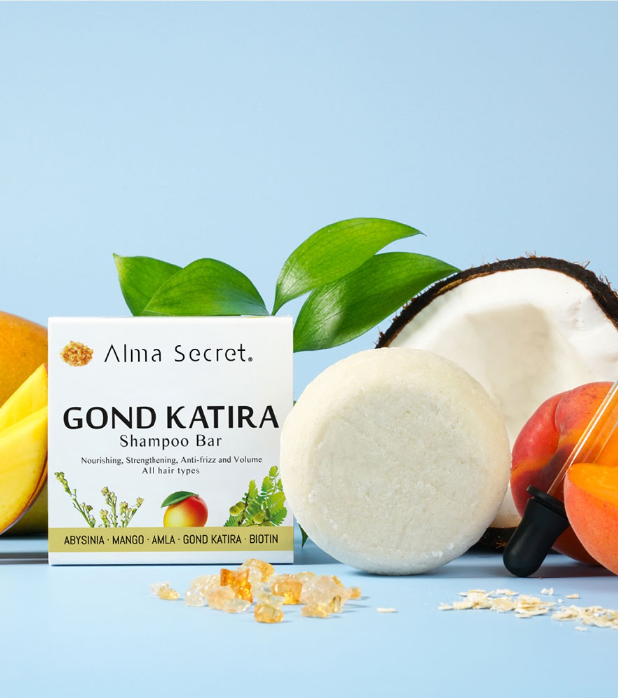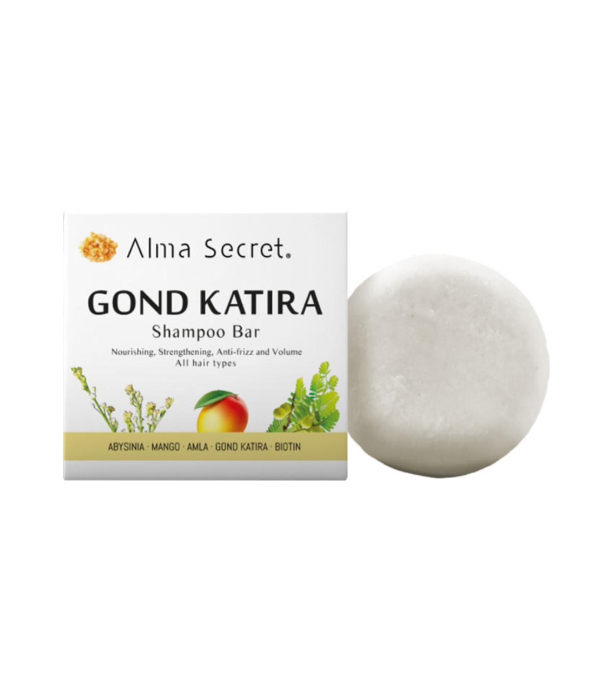 Entdecken Sie das stärkende und feuchtigkeitsspendende feste Shampoo Gond Katira von Alma Secret und genießen Sie ein stärkendes, feuchtigkeitsspendendes, Anti-Frizz- und Volumenprodukt.