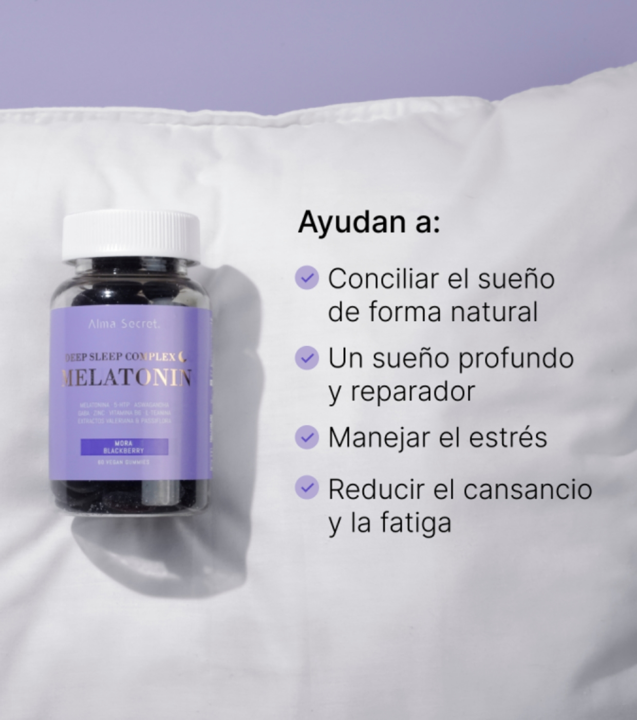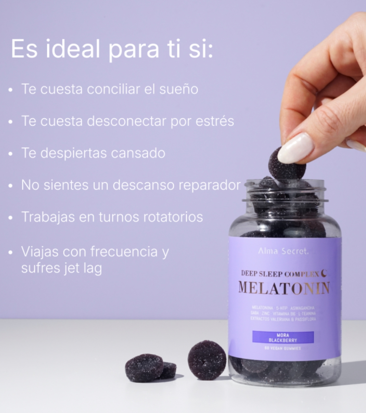 Gönnen Sie sich die tiefe Erholung, die Sie brauchen, mit diesen Fruchtgummis von Alma Secret. Sie enthalten 9 natürliche Wirkstoffe, die synergistisch wirken, um Entspannung zu fördern, Ihnen beim Einschlafen zu helfen und Ihre Schlafqualität zu verbessern.
