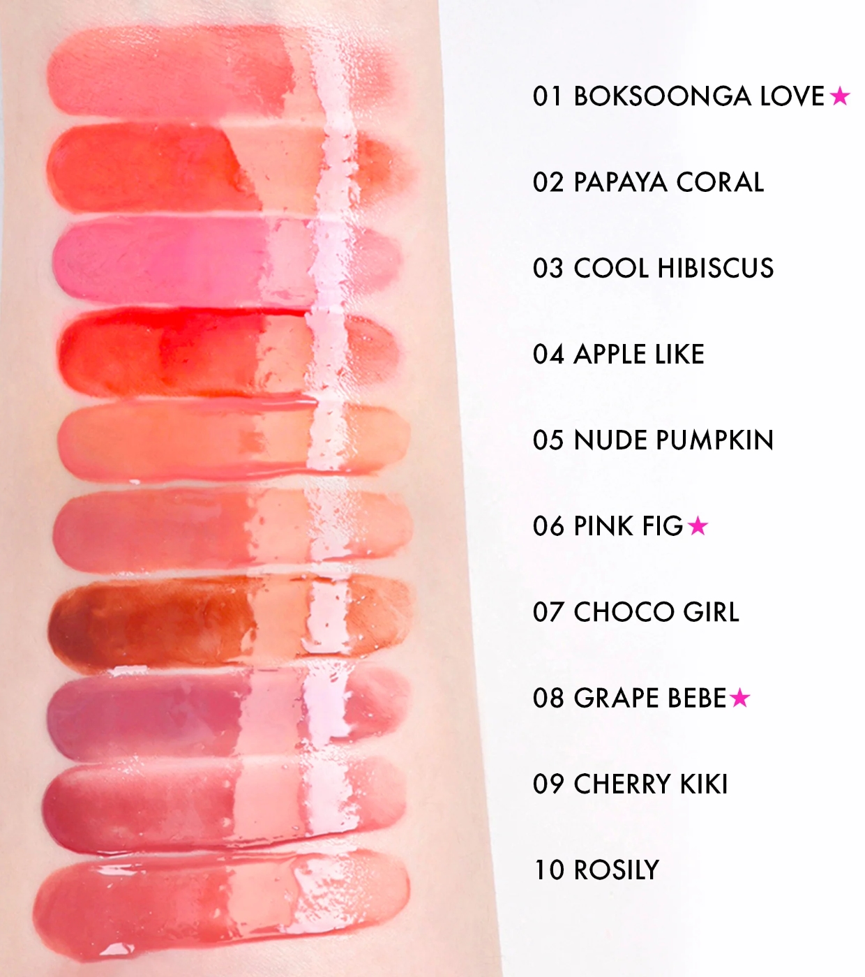 Water, Diphenyl Dimethicone, Diisostearyl Malate, Bis-Diglyceryl Polyacyladipate-2, Octyldodecanol, Hydrogenated Polyisobutene, Bis-Behenyl/Isostearyl/Phytosteryl Dimer Dilinoleyl Dimer Dilinoleate,Dipropylene Glycol, Cetyl PEG/PPG-10/1 Dimethicone, Sorbitan Isostearate, Polysorbate 60, Pentylene Glycol, Ceteareth-20, Hydroxyethyl Acrylate/Sodium Acryloyldimethyl Taurate Copolymer, Menthone Glycerin Acetal, Squalane, Titanium Dioxide (CI 77891), Phenoxyethanol, Stevia Rebaudiana Extract, Yellow 6 (CI 15985), Red 33 (CI 17200), Fragrance, Ethylhexylglycerin, Yellow 5 (CI 19140), Aluminum Hydroxide, Ammonium Polyacrylate, Rosa Canina Fruit Oil, Butylene Glycol, Blue 1 (CI 42090), 1,2-Hexanediol, Tremella Fuciformis (Mushroom) Extract, Pentaerythrityl Tetra-di-t-butyl Hydroxyhydrocinnamate, Red 28 (CI 45410), Hydrolyzed Sodium Hyaluronate, Sodium Hyaluronate, Rosa Damascena Flower Water, Sodium Hyaluronate Crosspolymer, Potassium Hyaluronate, Hydroxypropyltrimonium Hyaluronate, Hydrolyzed Hyaluronic acid, Hyaluronic Acid, Sodium Acetylated Hyaluronate, Tripeptide-1, Tripeptide-2, Tripeptide-3, Copper Tripeptide-1, Acetyl Hexapeptide-8, Acetyl Octapeptide-3, Palmitoyl Pentapeptide-4, Palmitoyl Tetrapeptide-7, Palmitoyl Tripeptide-1