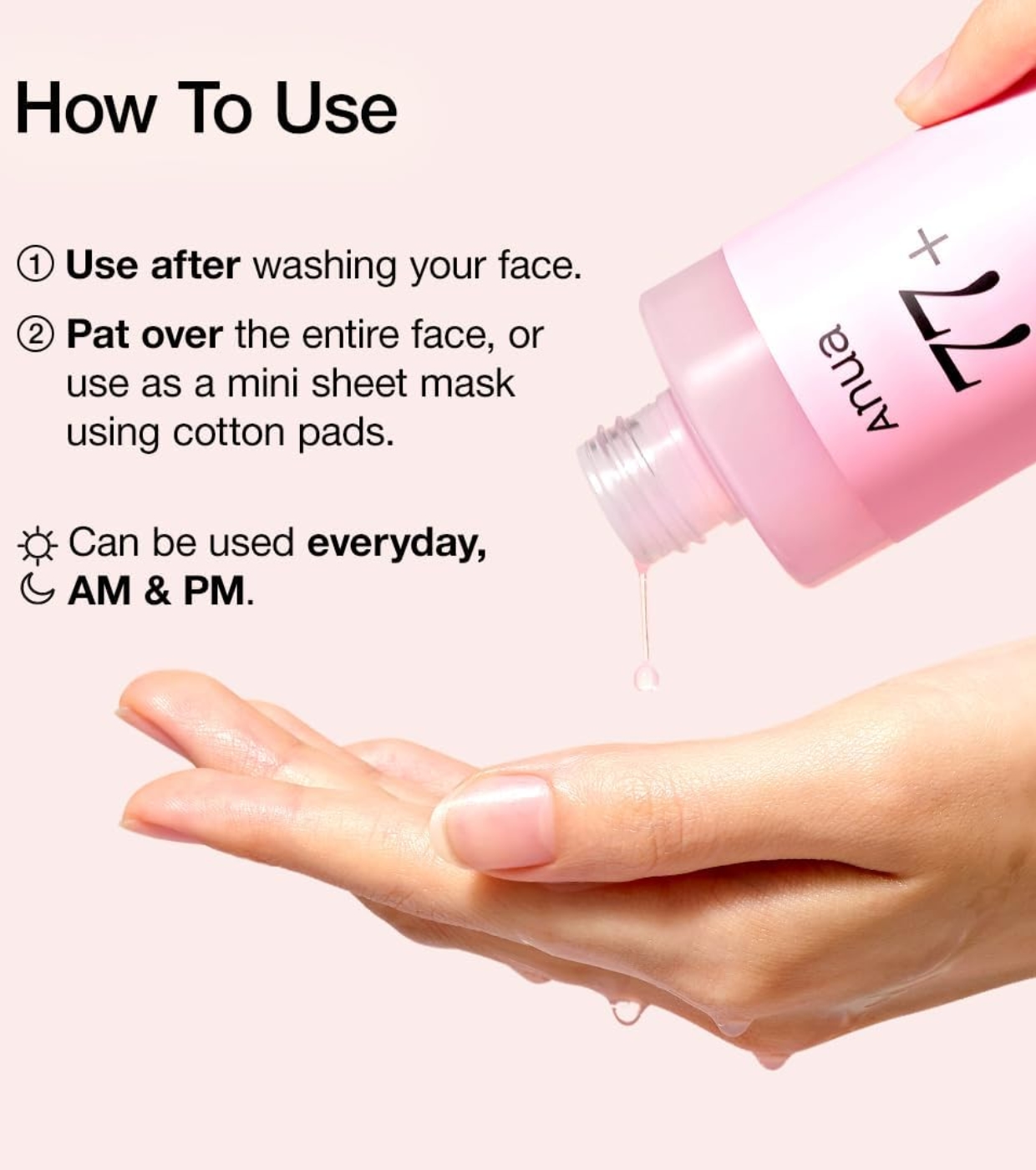 1. Nach der Reinigung eine moderate Menge auf das Gesicht auftragen und sanft einklopfen, um die Aufnahme zu verbessern.