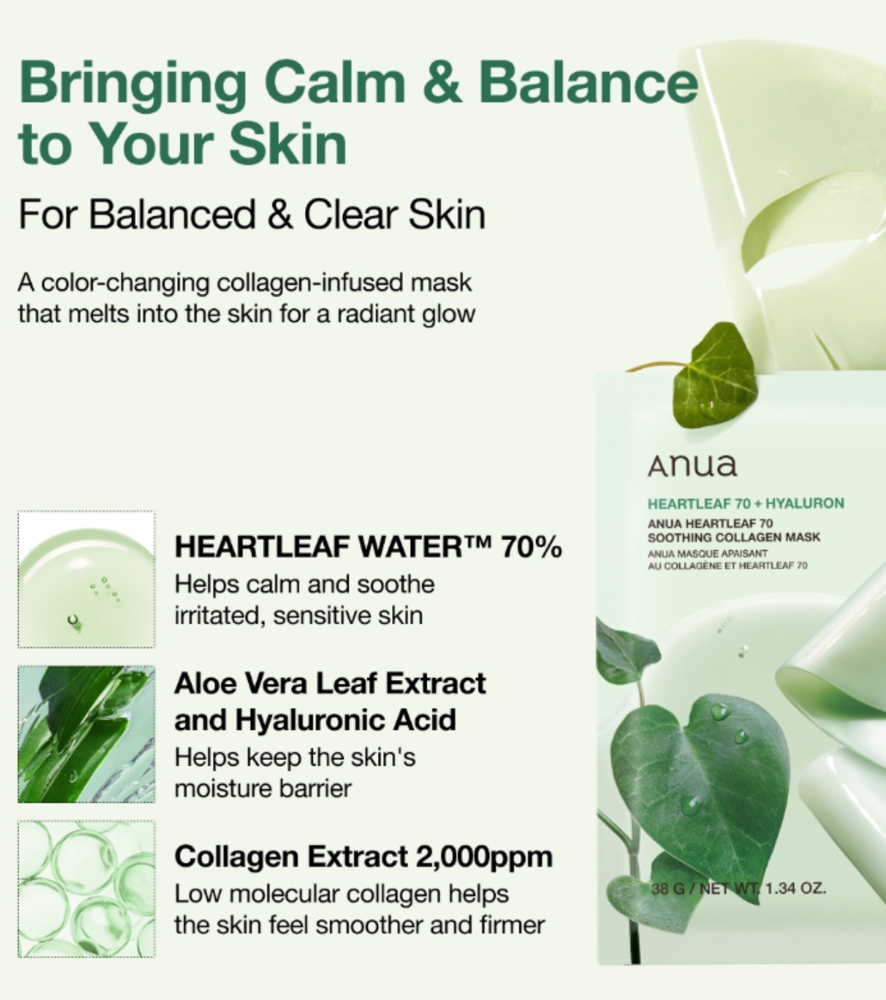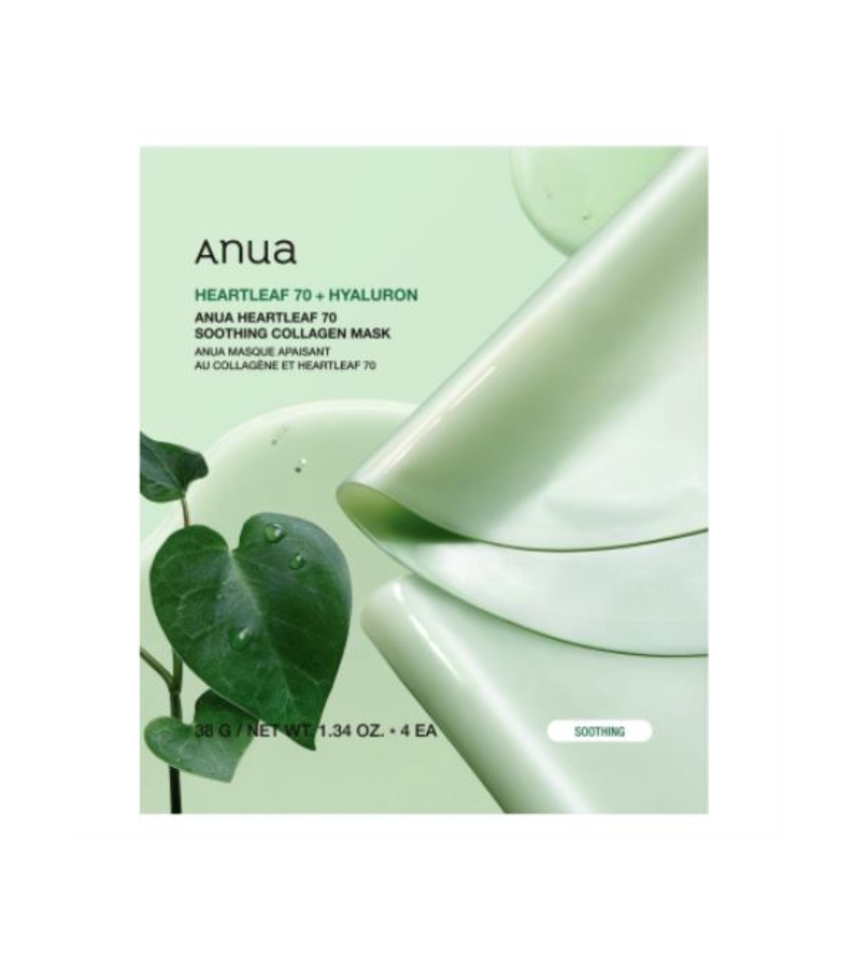 Anua Anua Collagen Soothing Mask ist eine innovative Maske mit Heartleaf Water und Kollagen mit niedrigem Molekulargewicht (300Da), die intensive Feuchtigkeitsversorgung bietet, die Haut beruhigt und die Elastizität verbessert.