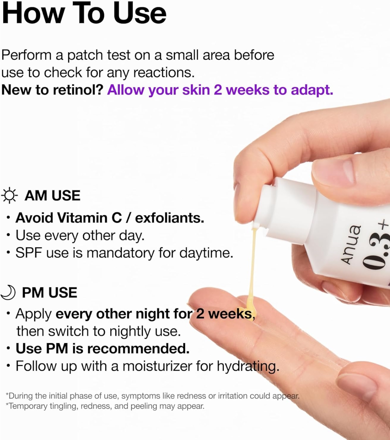 Empfehlung: Abends auf die gereinigte, trockene Haut auftragen. Tagsüber Sonnenschutz verwenden. Retinol schrittweise einführen, wenn Sie es noch nie verwendet haben.