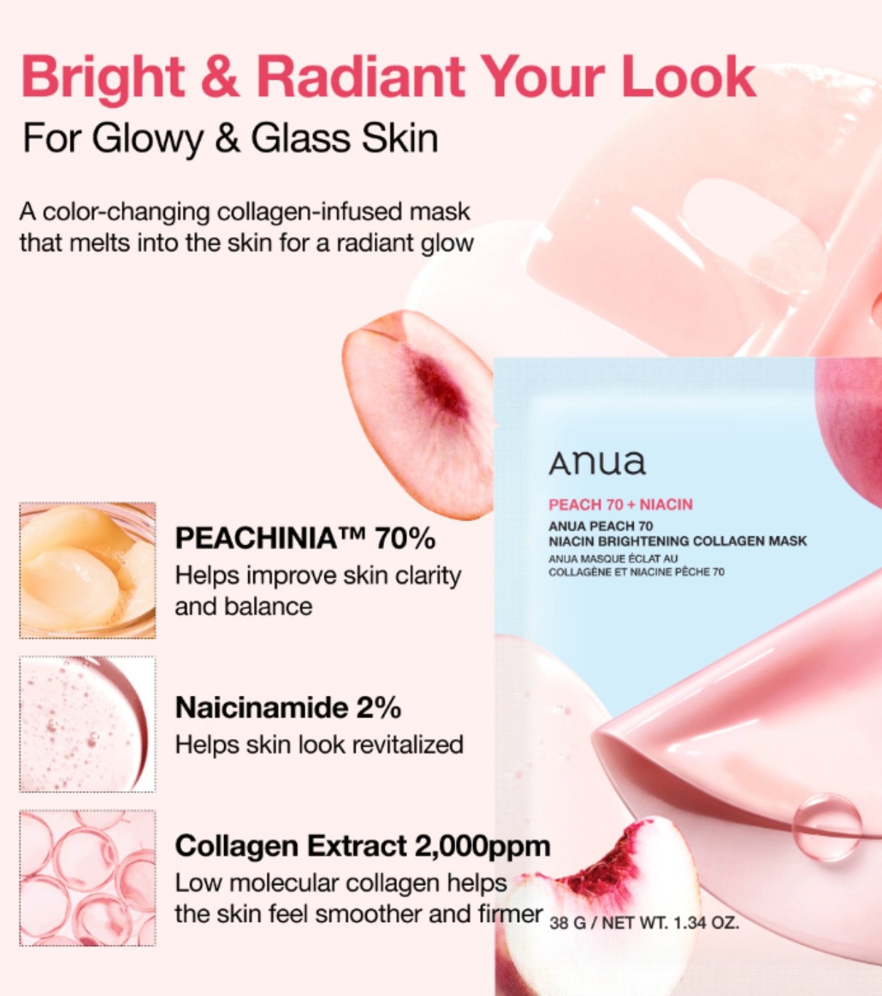 Anua Collagen Brightening Mask Anua ist eine innovative Maske, die die Haut dank ihrer mit Pfirsichwasser, Niacinamid und Kollagen mit niedrigem Molekulargewicht (300Da) angereicherten Formel hydratisiert, aufhellt und strafft.