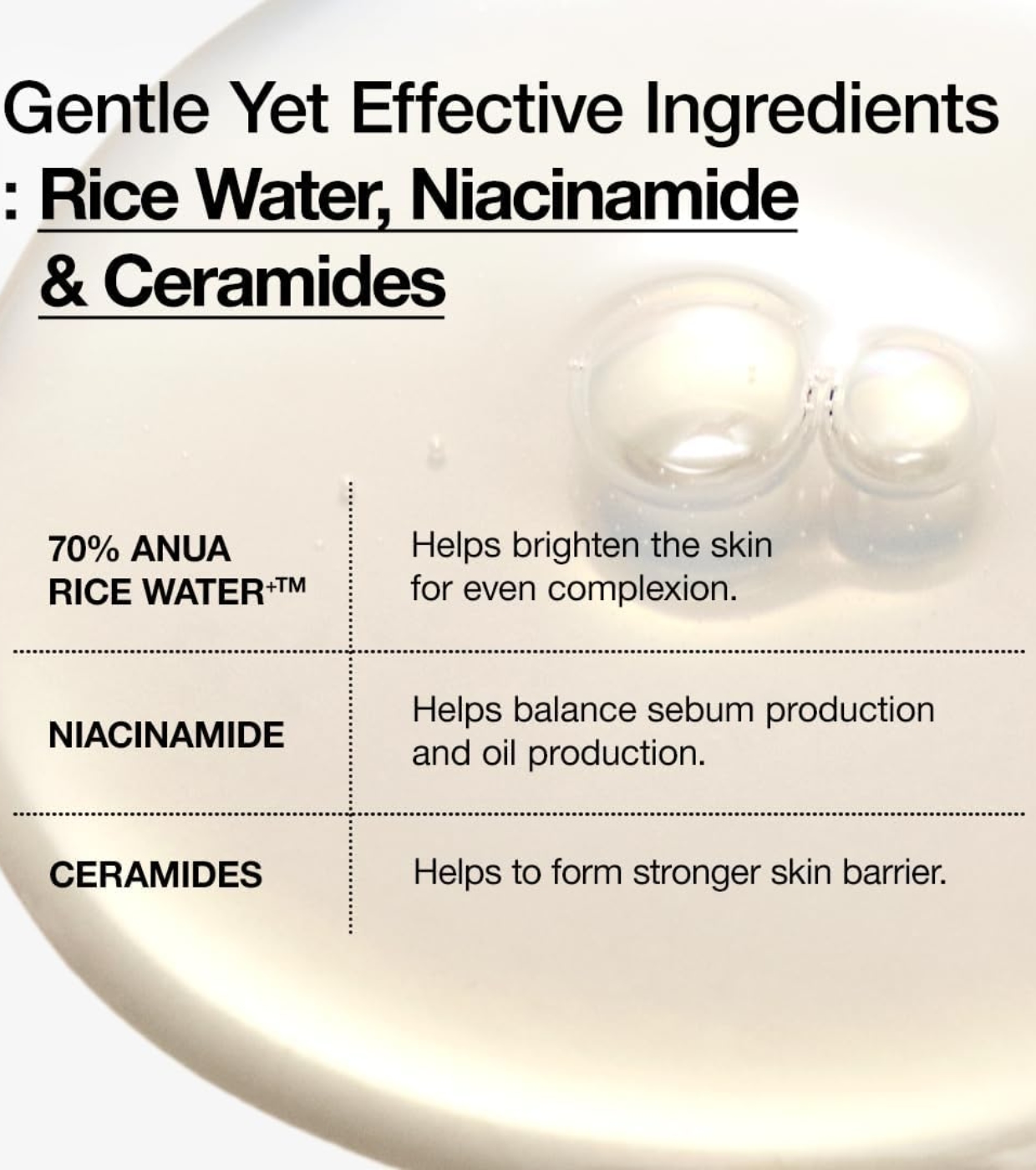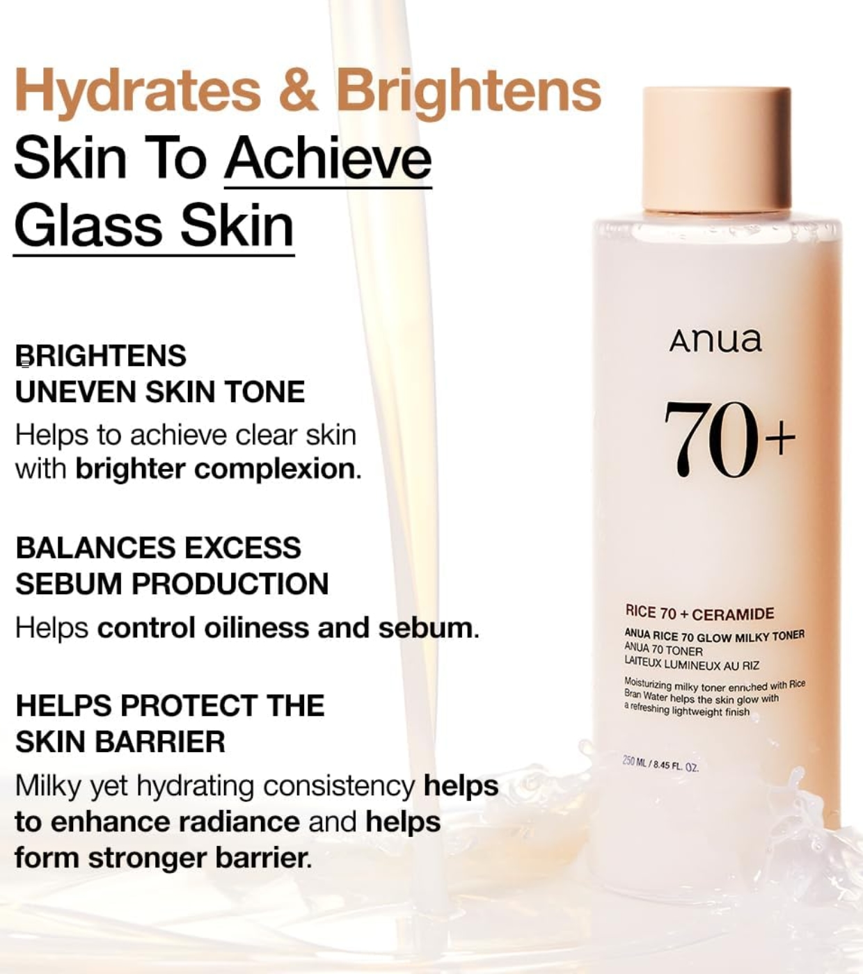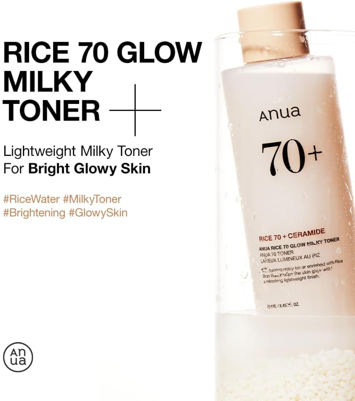 Ein leichtes Rice 70 + Ceramide Glow Milky Gesichtswasser von Anua mit einer leichten und milchigen Textur mit 70 % Reiswasser.