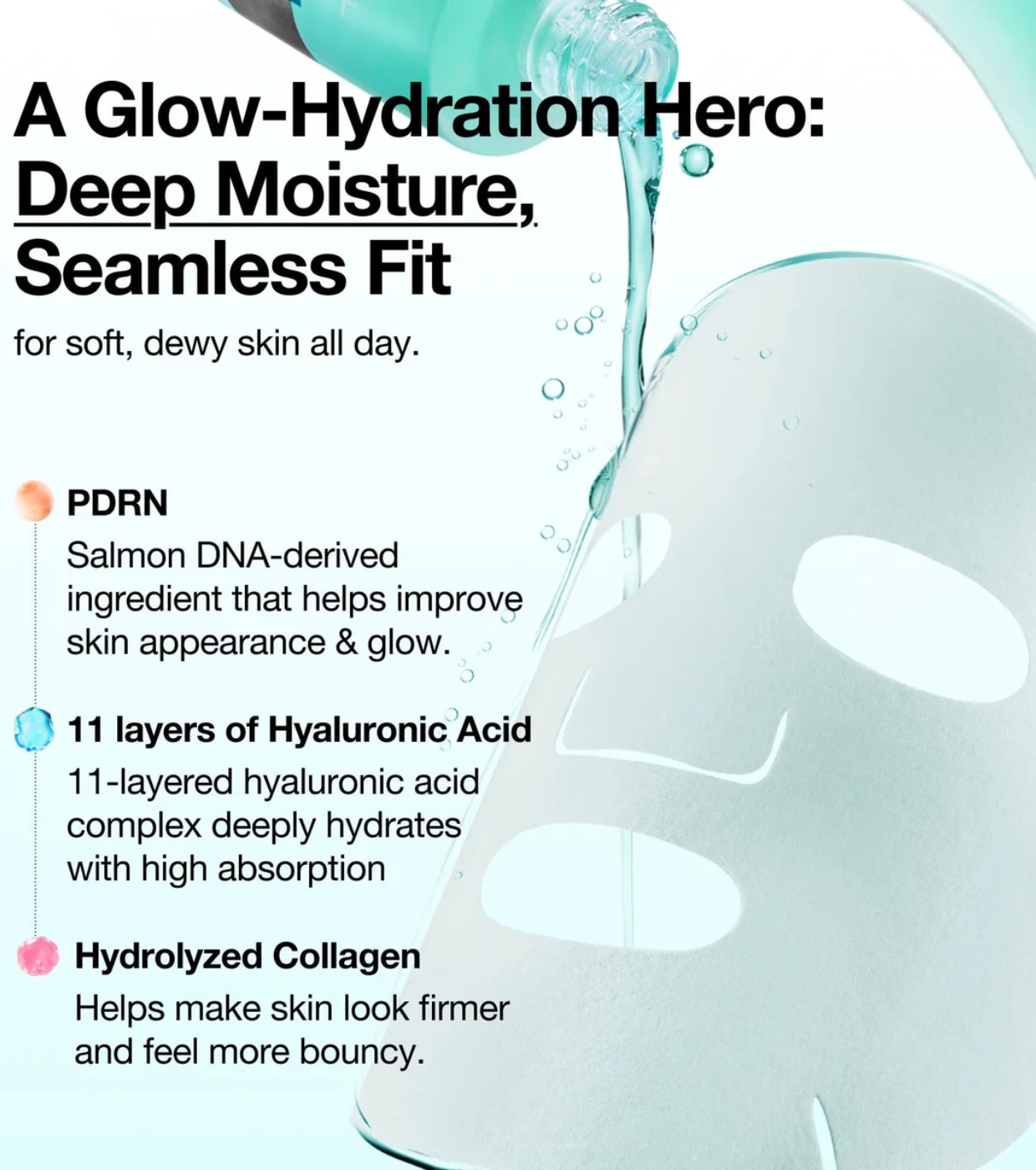 Die Formel kombiniert niedermolekulares PDRN, einen Komplex aus 11 Arten von Hyaluronsäure und hydrolysiertem Kollagen und bietet so eine intensive Behandlung, die die Haut in nur 20 Minuten verwandeln kann.