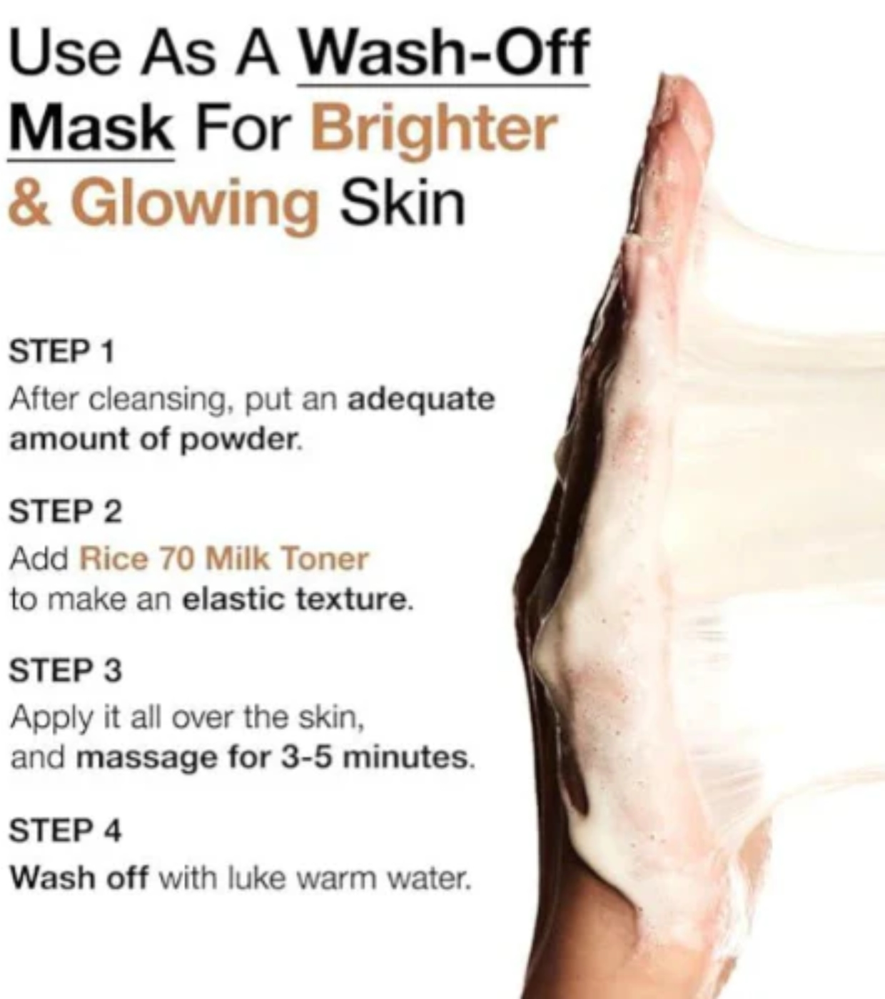 Zea Mays (Corn) Starch , Sodium Cocoyl Isethionate , Sodium Lauroyl Glutamate , Diglycerin, Allantoin, Maltodextrin, Papain, Kaolin (Ci 77004) , Zea Mays (Corn) Starch, Sodium Cocoyl Isethionate, Sodium Lauroyl Glutamate, Diglycerin, Allantoin, Maltodextrin, Papain, Sodium Bicarbonate, Citric Acid, Sodium Polyacrylate, Water, Oryza Sativa (Rice) Powder, Oryza Sativa (Rice) Lees Extract , Oryza Sativa (Rice) Bran Water , 1,2-Hexanediol, Oryza Sativa (Rice) Extract, Water, Butylene Glycol, 1,2-Hexanediol , Dipropylene Glycol, Oryza Sativa (Rice) Extract, Hydrolyzed Rice Protein, Oryza Sativa (Rice) Seed Protein, Ceramide NP, Ceramide NP, Ascorbic Acid, Alpha-Arbutin, Protease, Butylene Glycol, 1,2-Hexanediol, Caprylyl Glycol , Glucose, Papain , Glycerin, Water, Citric Acid, Tartaric Acid, Lactic Acid.