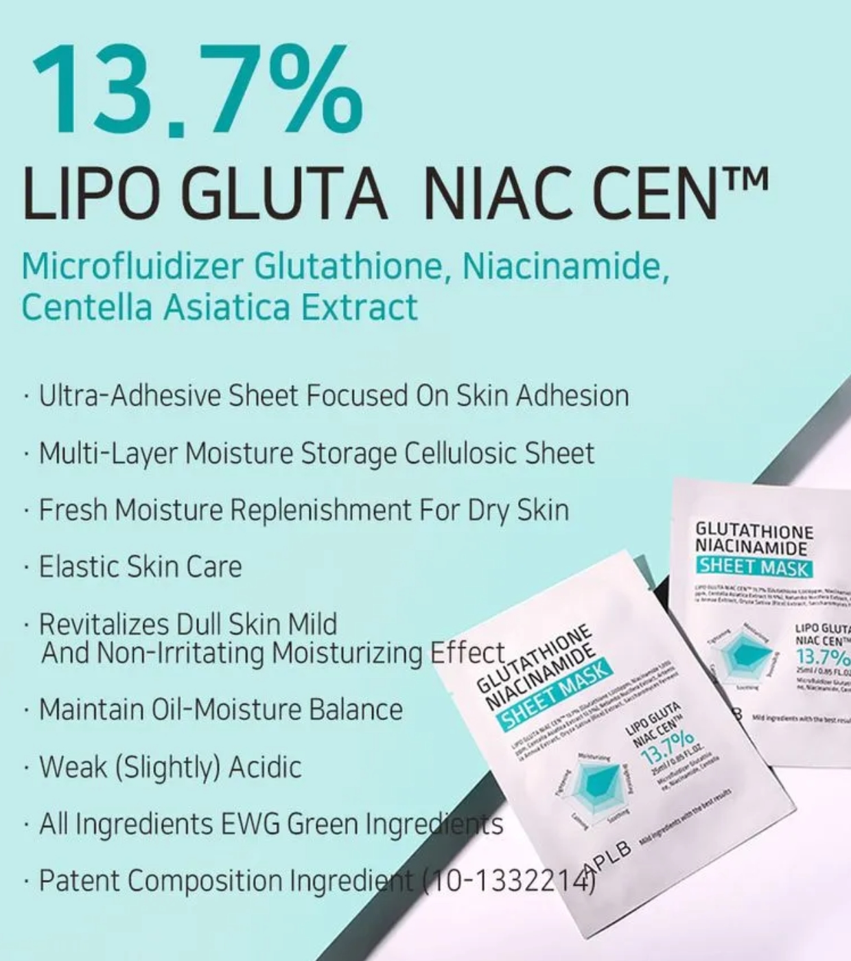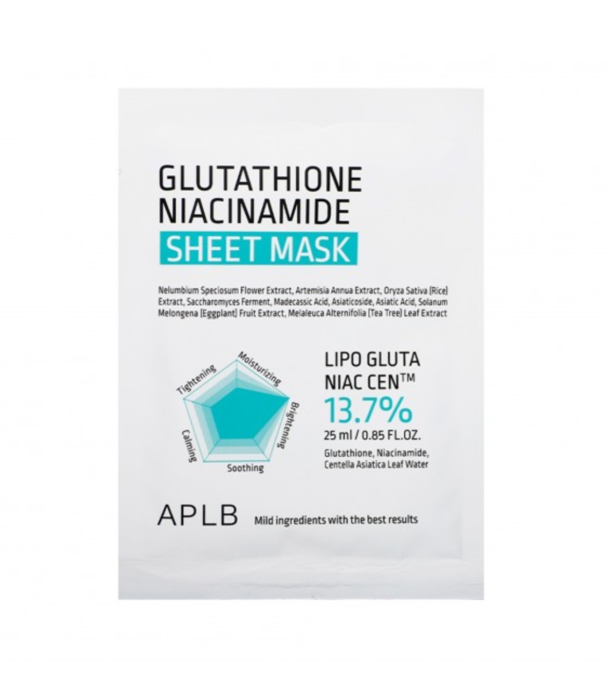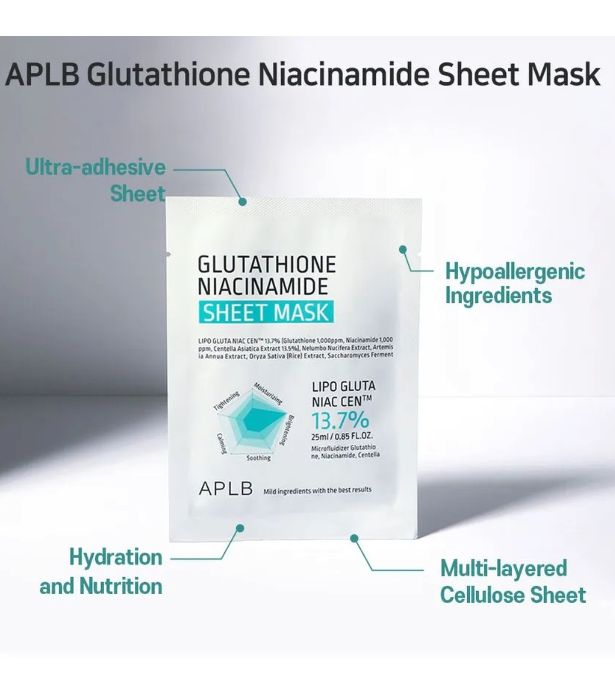 Die Glutathione Niacinamide Sheet Mask von APLB ist eine ultradünne Gesichtsmaske aus Gewebe, die müde, fahle oder empfindliche Haut mit Feuchtigkeit versorgt, beruhigt und aufhellt.