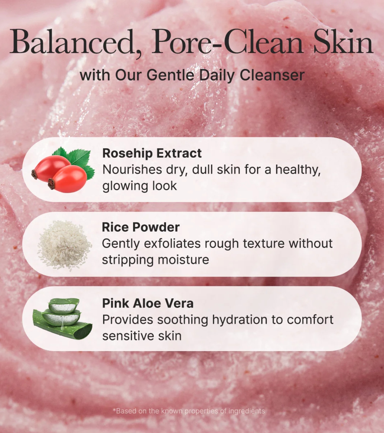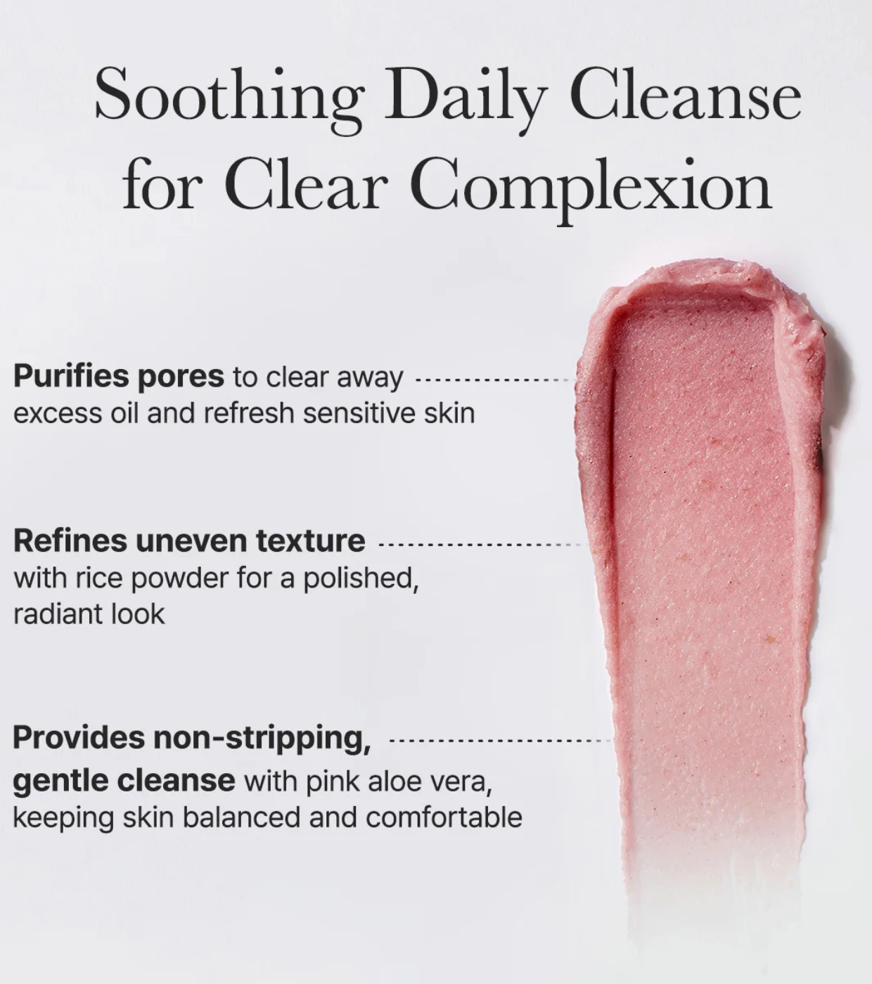 Die Formel kombiniert fermentierten Reis, Hagebutte und rosa Aloe – eine Synergie von Inhaltsstoffen, die effektiv reinigt, ohne die Hautbarriere zu beeinträchtigen.