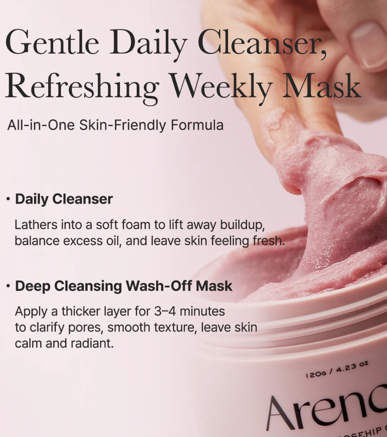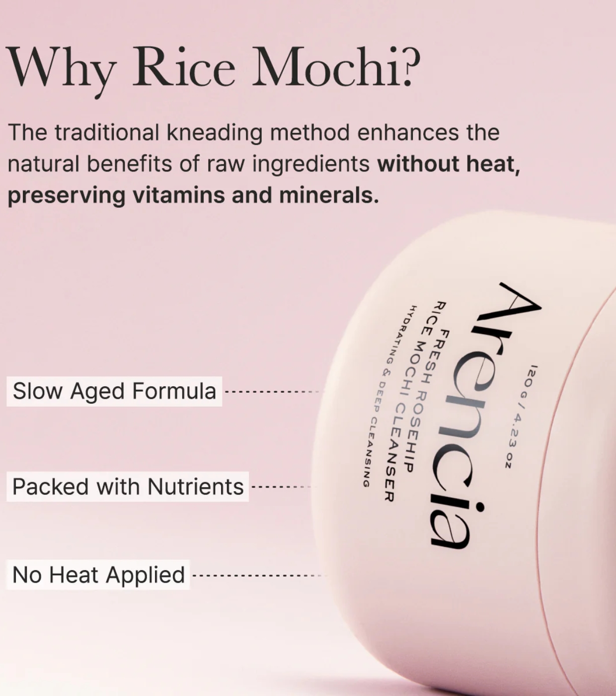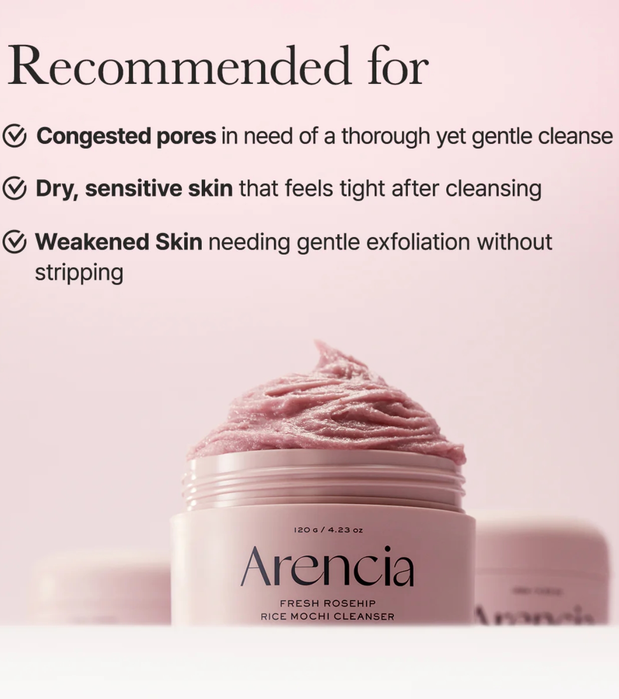 Der Fresh Rosehip Mochi Cleanser von Arencia ist ein sanfter, schäumender Gesichtsreiniger, der entwickelt wurde, um Hautton, Hautstruktur und Feuchtigkeit zu verbessern, Rötungen zu lindern und das Auftreten von Mitessern zu minimieren.