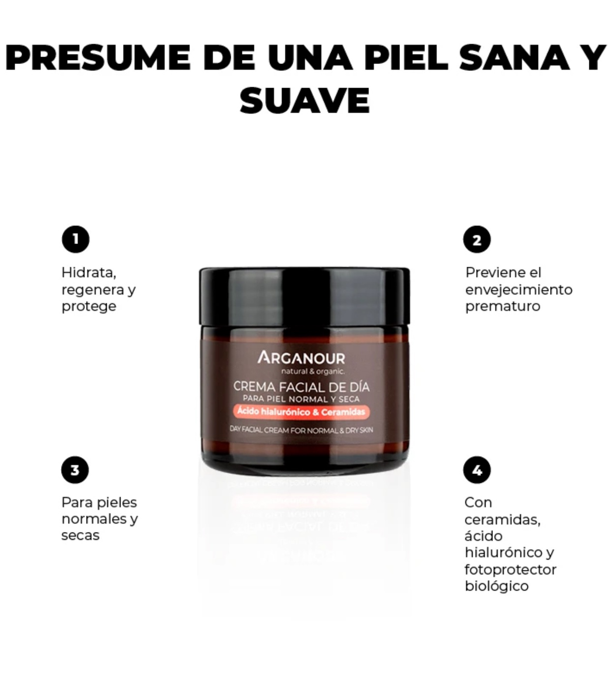 Arganour Anti-Aging-Gesichtscreme für normale und trockene Haut ist eine Tagescreme, die die Haut intensiv mit Feuchtigkeit versorgt und nährt und ihre Elastizität, Festigkeit und Weichheit sichtbar verbessert.