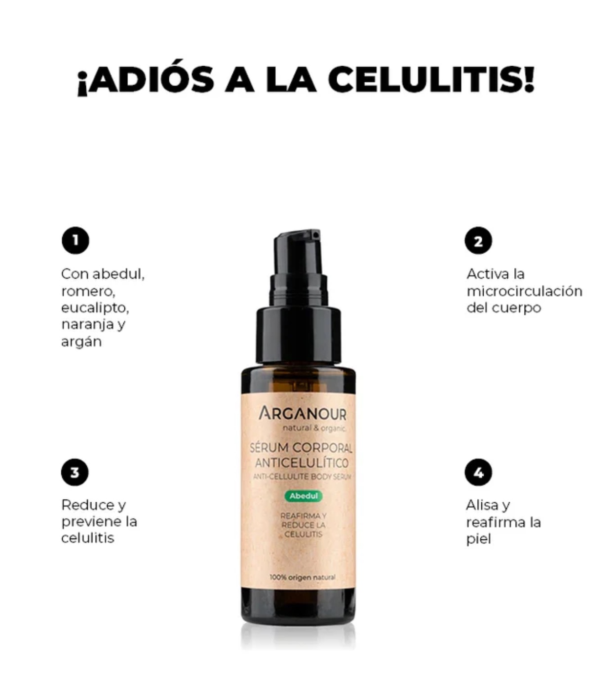 Das Anti-Cellulite-Körperserum von Arganour ist eine Behandlung mit Birken-, Rosmarin-, Eukalyptus-, Orangen- und Arganölen, die den Stoffwechsel der Haut aktiviert und die Fettmobilisierung und Mikrozirkulation fördert.