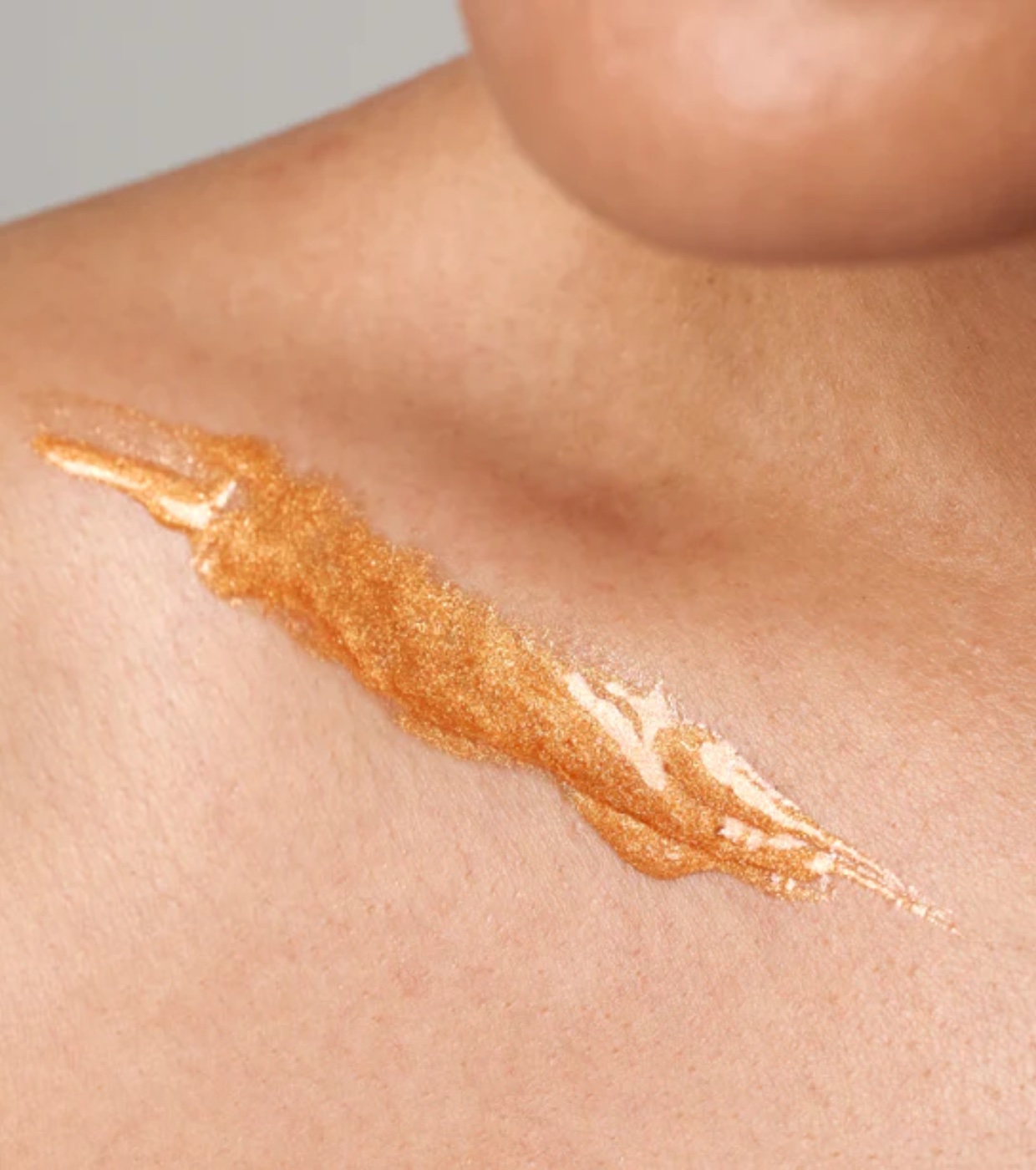 - Natürliche Glimmer: Perlmuttartige Mineralpigmente unterschiedlicher Größe, die der Haut einen subtilen und unwiderstehlichen goldenen Schimmer verleihen, als wäre sie eine feine Glitzerschicht.