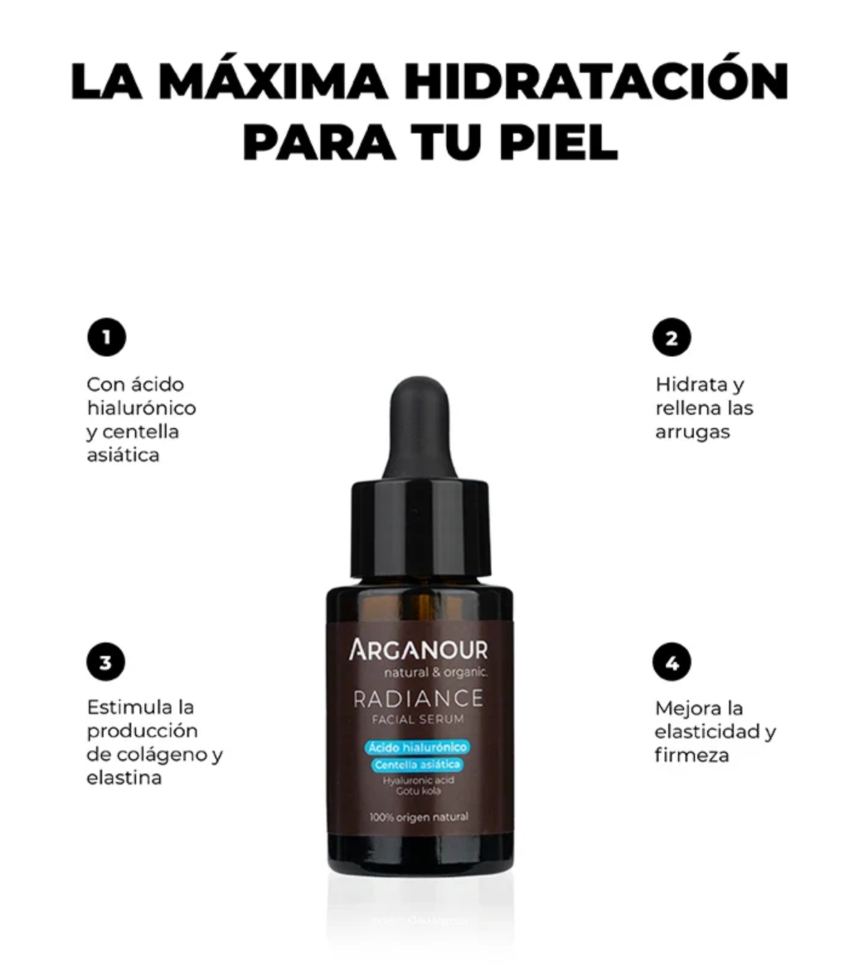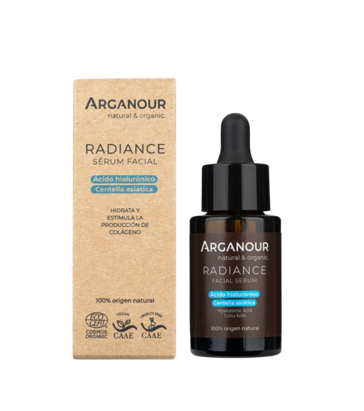 Holen Sie sich einen jünger aussehenden Teint mit Arganours 100 % natürlichem Radiance-Gesichtsserum aus Hyaluronsäure und Centella Asiatica .