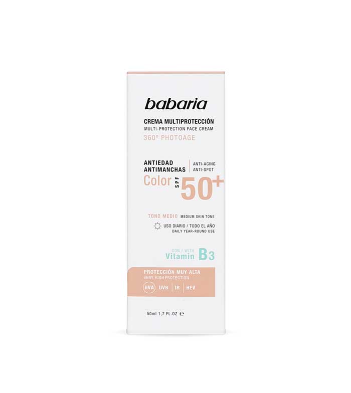 Multi-Schutz-Gesichtscreme mit Farbe SPF50 + 360º Photoage von mittlerem Ton, von Babaria.