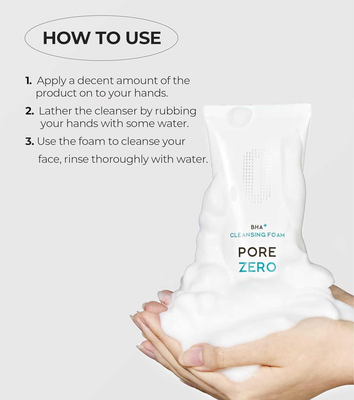Geben Sie eine kleine Menge auf die nassen Hände, massieren Sie sie in Ihr Gesicht, bis ein weicher, zarter Schaum entsteht, und spülen Sie sie gründlich mit warmem Wasser ab.