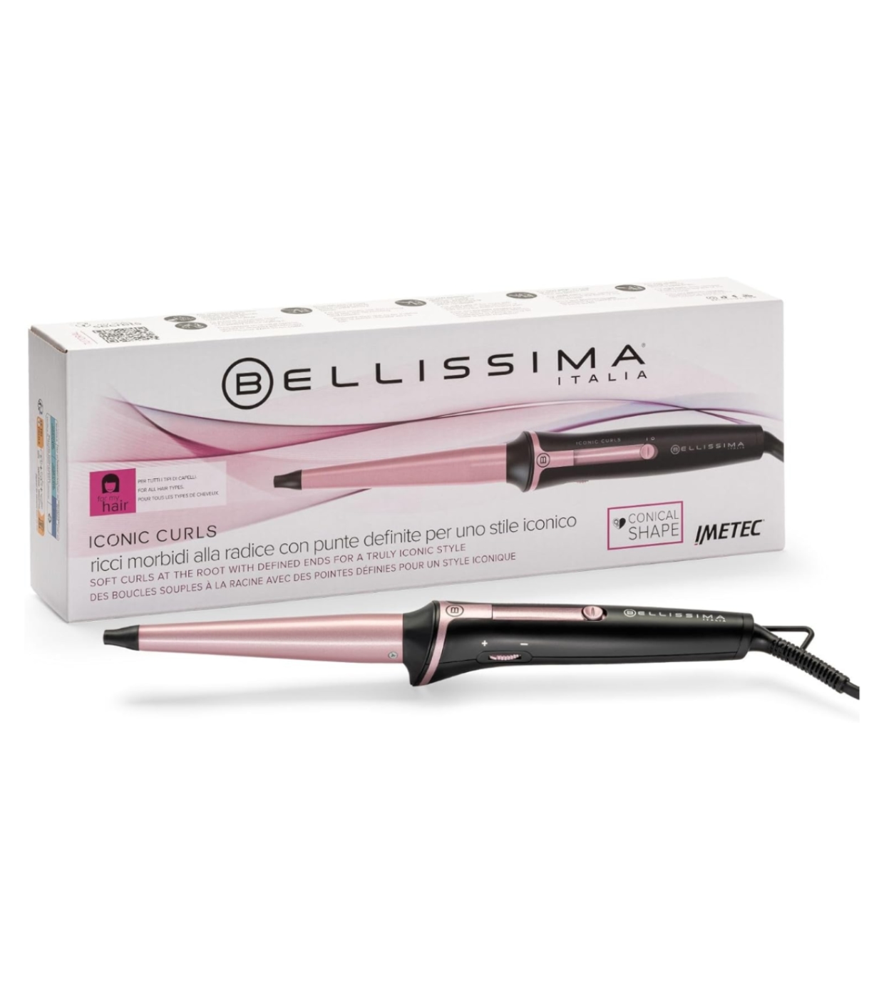 Bellissima Iconic Curl ist der perfekte konische Lockenstab, um natürlich aussehende, definierte Locken voller Bewegung zu kreieren.