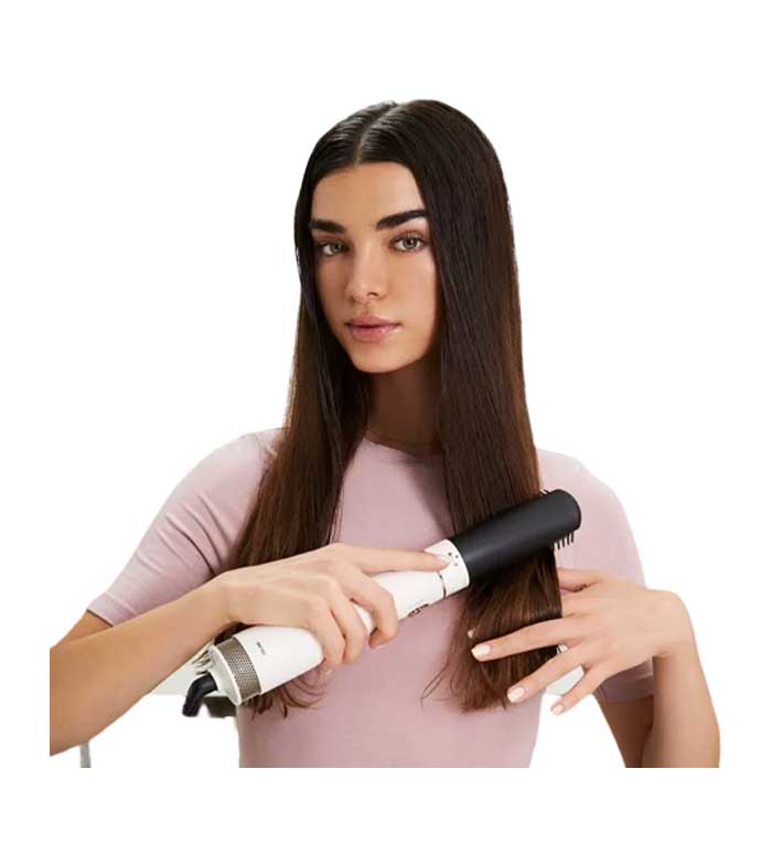 Die 50-mm-Rundbürste Straight&Wavy ist ideal für langes Haar: Der Effekt ist weich und wellig, und das Haar wird durch Keramik und Keratin geschützt.