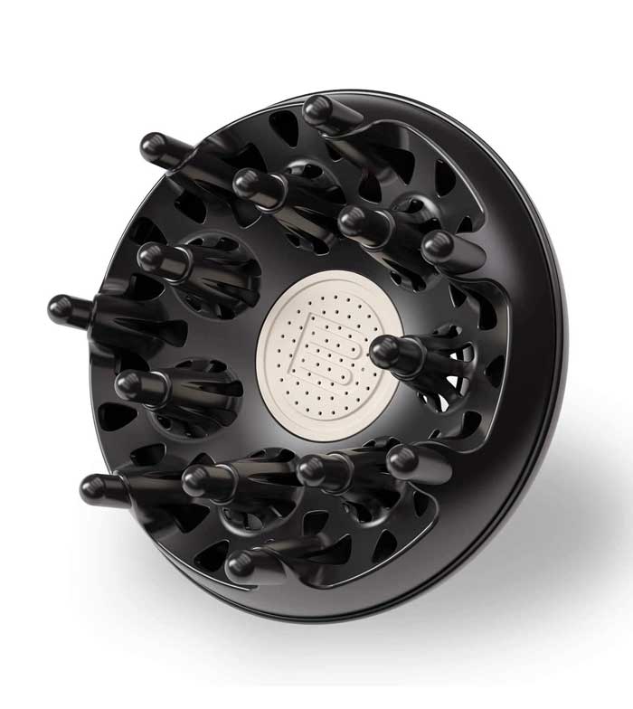 Ausgestattet mit einem schmalen professionellen Keramikkonzentrator zum Stylen, einem Keramikdiffusor, um den Locken Elastizität zu verleihen, und einer Düse zum Trocknen.
