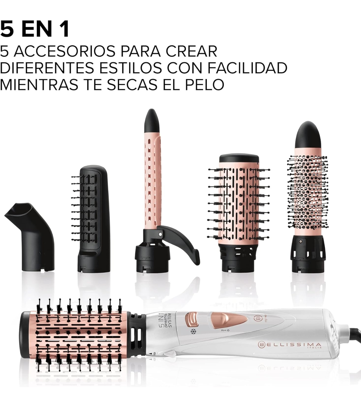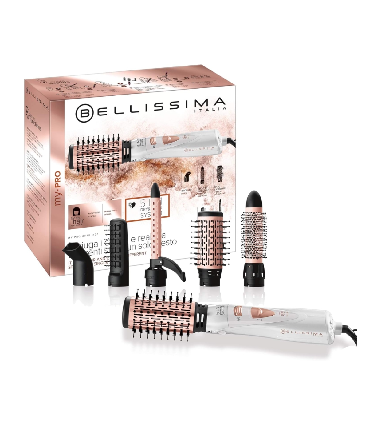 Bellissima Dry&Style System GH18 1100 ist die 5-in-1-Heißluftbürste, die in einem einzigen Schritt trocknet und stylt und Ihnen so mehrere Styles ermöglicht: glattes und voluminöses Haar, weiche Wellen, geformte Spitzen oder definierte Locken.