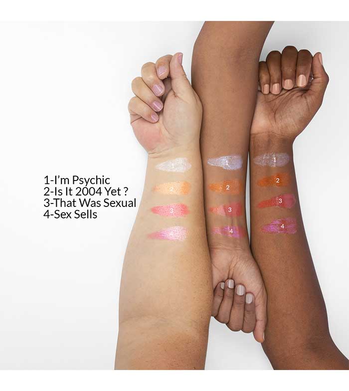I'm Psychic, Is It 2004 Yet?, Sex Sells, or That Was Sexual Shade: Polybutene, Caprylic/Capric Triglyceride, Diisostearyl Malate, Silica Silylate, Synthetic Fluorphlogopite (Only in That Was Sexual, I'm Psychic, & Is It 2004 Yet?), Calcium Titanium Borosilicate (Only in I'm Psychic), Phenoxyethanol, Caprylyl Glycol, Mica (Only in Sex Sells, & Is It 2004 Yet?), Tocopheryl Acetate, Calcium Aluminum Borosilicate (Only in Sex Sells), Tin Oxide (Only in I'm Psychic, Sex Sells, & Is It 2004 Yet?), Silica (Only in Sex Sells), Alumina (Only in That Was Sexual), Glycerin (Only in That Was Sexual). May Contain/Peut Contenir [+/-: Titanium Dioxide (CI 77891), Iron Oxides (CI 77491, CI 77492, CI 77499), D&C Red 28 Lake (CI 45410), D&C Red 30 Lake (CI 73360)].