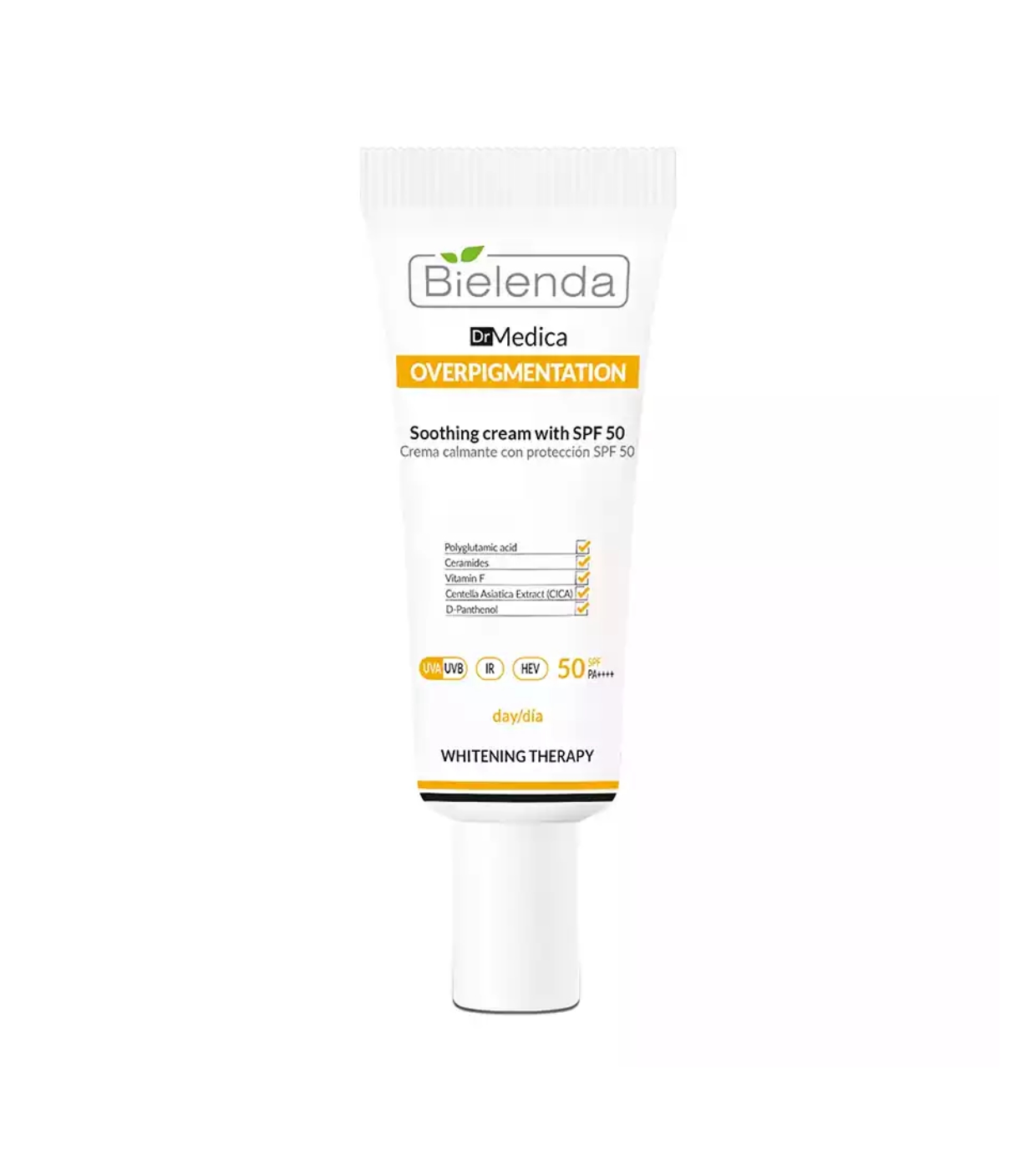 Pflegen Sie Ihre Haut täglich mit diesem Breitband-Sonnenschutzmittel mit Lichtschutzfaktor 50 von Bielenda , das speziell für Haut mit Hyperpigmentierung, Sonnenflecken und ungleichmäßigem Hautton entwickelt wurde.