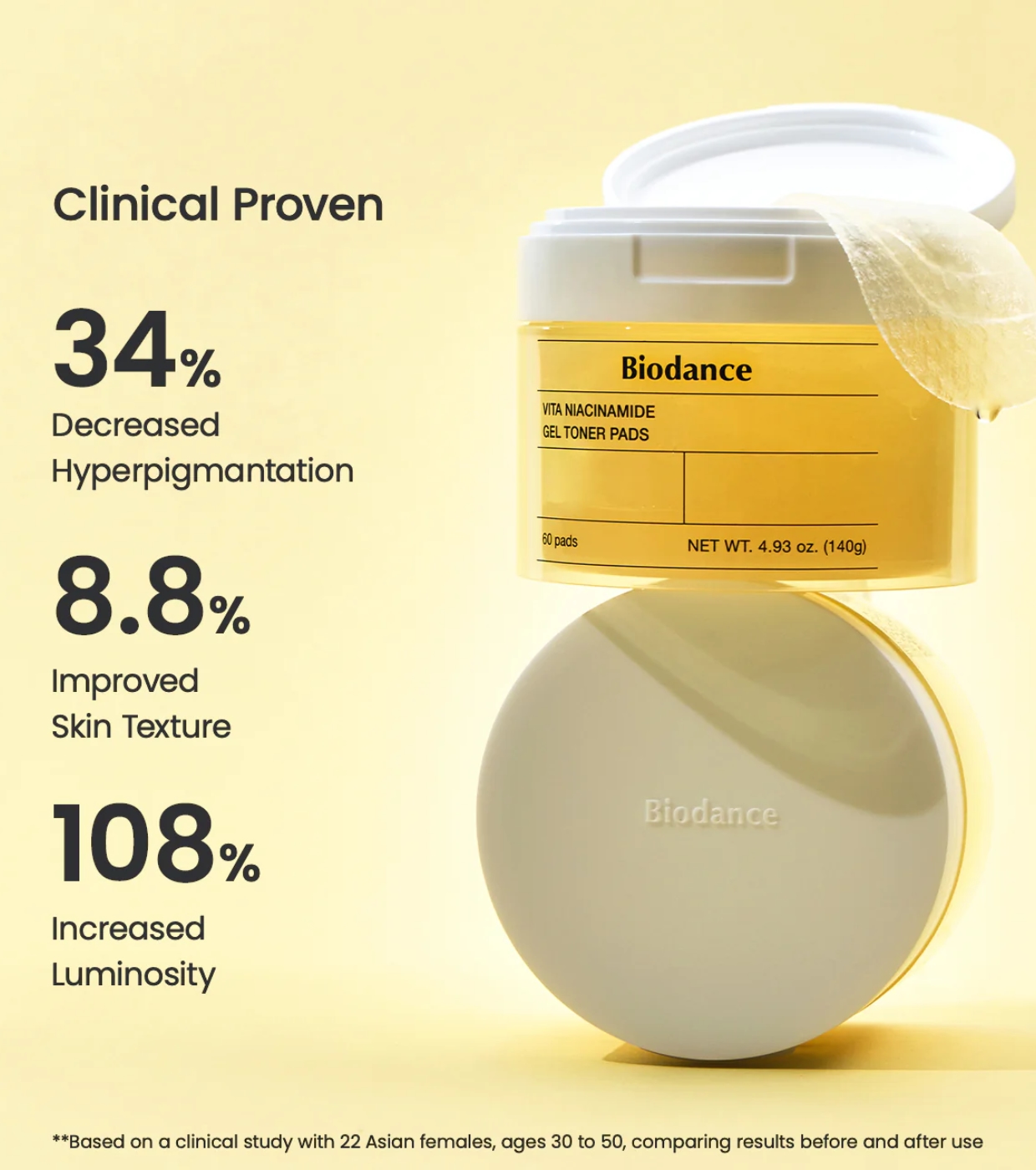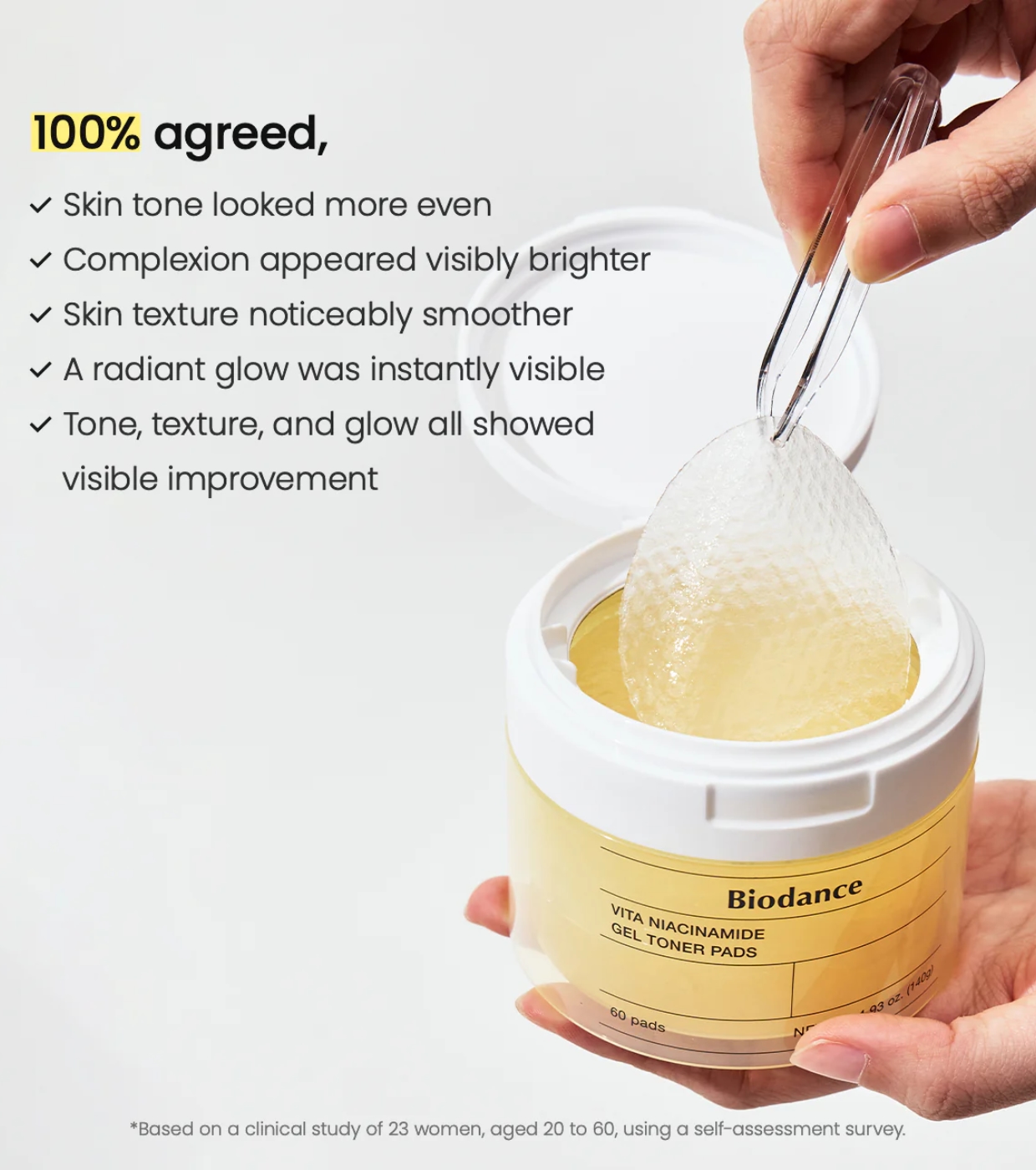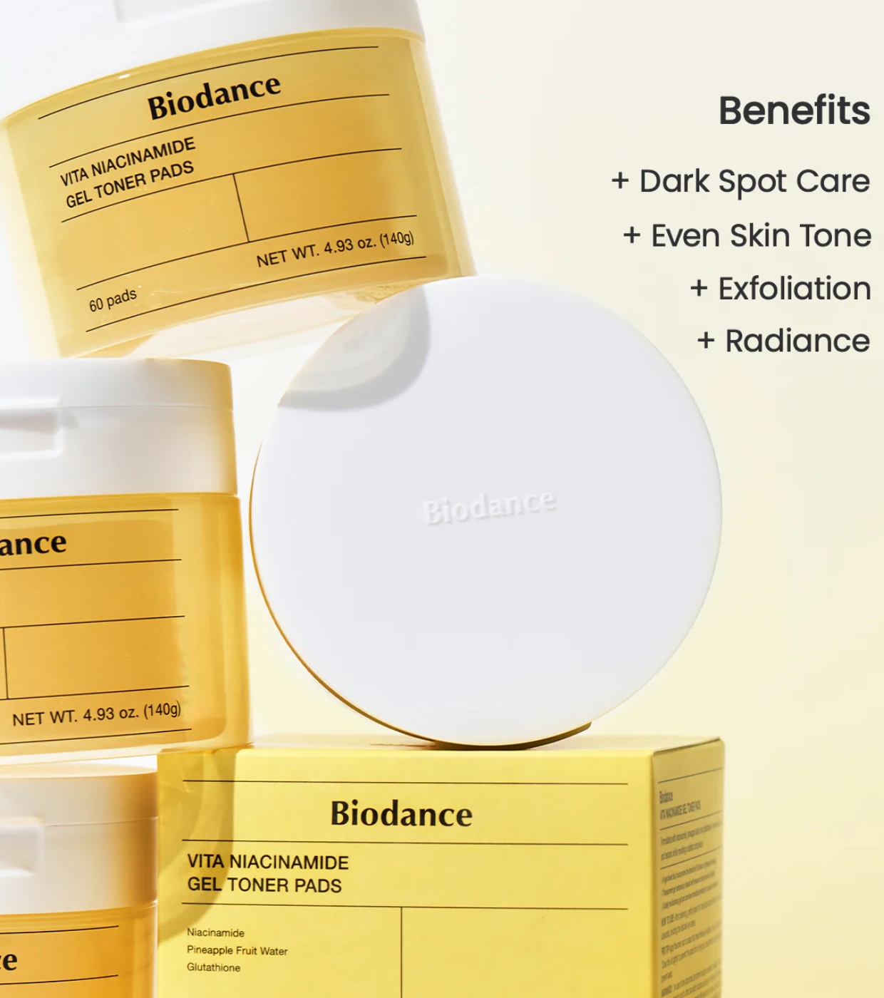 Entdecken Sie strahlendere, glattere und ebenmäßigere Haut mit den Vita Niacinamide Gel Toner Pads. Die perfekte Ergänzung für Ihre tägliche Hautpflege.