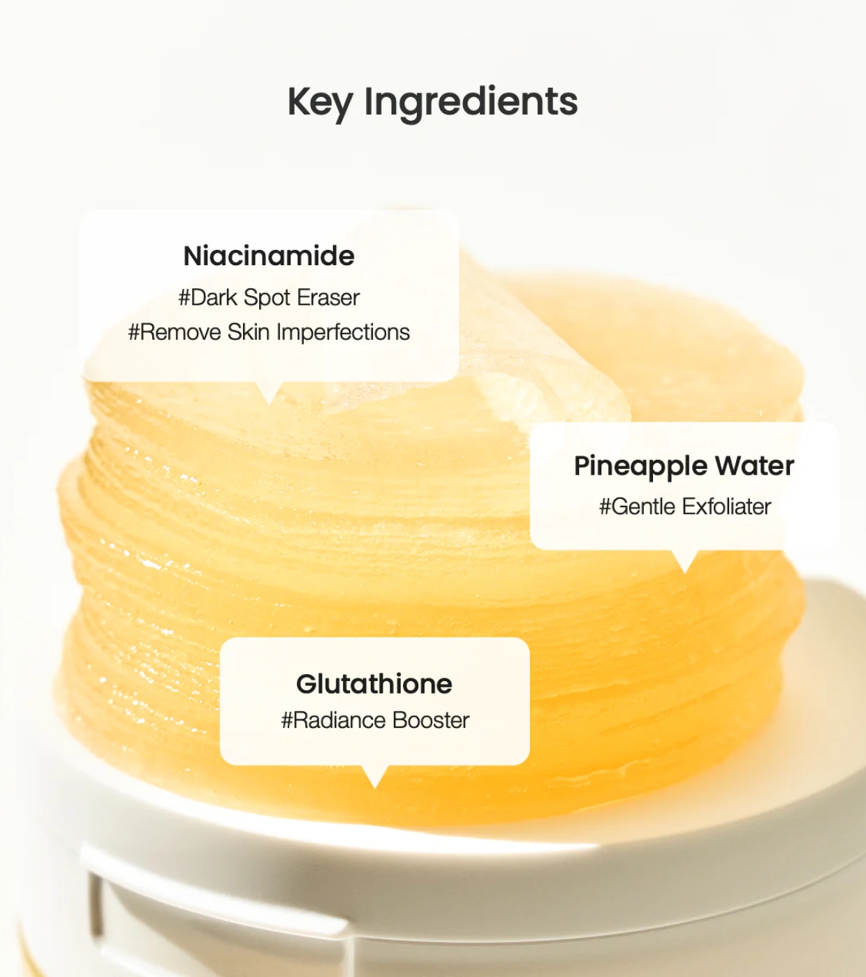 Water, Ananas Sativus (Pineapple) Fruit Water(100,000ppm), Glycerin, Acrylates Copolymer, Niacinamide(20,000ppm), 1,2-Hexanediol, Ceratonia Siliqua (Carob) Gum, Betaine, Chondrus Crispus, Polyglyceryl-10 Laurate, Potassium Chloride, Sucrose, Polyglyceryl-2 Triisostearate, Allantoin, Agar, Cellulose Gum, Ethylhexylglycerin, Butylene Glycol, Adenosine, Pyrus Communis (Pear) Fruit Extract, Sclerotium Gum, Disodium EDTA, Rosa Damascena Flower Water, Melia Azadirachta Leaf Extract, Melia Azadirachta Flower Extract, Iris Florentina Root Extract, Ananas Sativus (Pineapple) Fruit Extract, Hippophae Rhamnoides Oil, Cucumis Melo (Melon) Fruit Extract, Curcuma Longa (Turmeric) Root Extract, Hedera Helix (Ivy) Leaf/Stem Extract, Ocimum Sanctum Leaf Extract, Corallina Officinalis Extract, Tocopherol, Sodium Hyaluronate, Hydrolyzed Hyaluronic Acid, Gluconolactone, Boron Nitride, Caprylyl Glycol, Hydroxypropyltrimonium Hyaluronate, Glutathione, Sodium Acetylated Hyaluronate, Hyaluronic Acid, Hydrolyzed Sodium Hyaluronate, Sodium Hyaluronate Crosspolymer, Potassium Hyaluronate