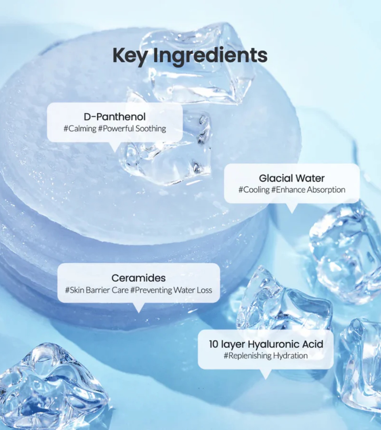 Mit einer mit 100.000 ppm Gletschermilch angereicherten Formel bieten diese Pads einen starken Erfrischungseffekt und eine schnelle, tiefe Feuchtigkeitsversorgung.