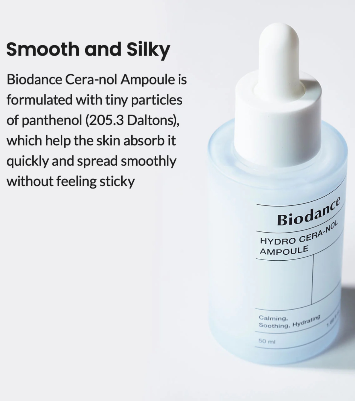 Beruhigen, hydratisieren und stärken Sie Ihre Haut mit der Biodance Hydro Cera-nol Ampulle , einer fortschrittlichen Formel, die Panthenol mit niedrigem Molekulargewicht, mehrschichtige Ceramide und Hyaluronsäure kombiniert, um die Hautbarriere wiederherzustellen und tiefe Feuchtigkeit zu spenden, ohne ein klebriges Gefühl zu hinterlassen.