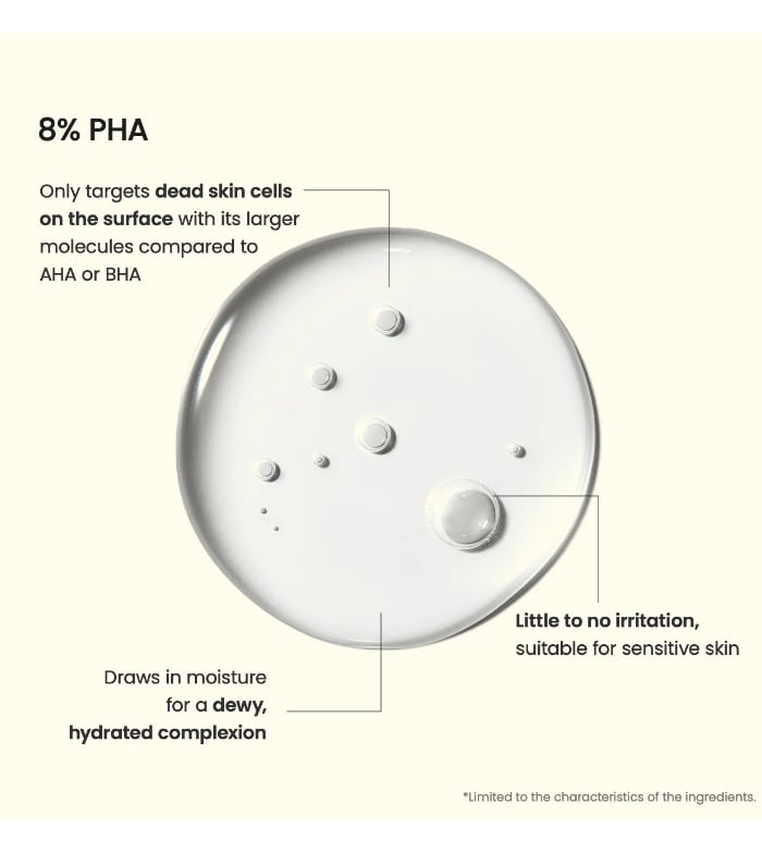 Seine fortschrittliche Formel mit 8 % PHA entfernt sanft abgestorbene Hautzellen, ohne Reizungen zu verursachen, während sein Komplex aus 5 Arten von Ceramiden, essentiellen Fettsäuren und NMF (natürlichen Feuchtigkeitsfaktoren) dabei hilft, die Hautbarriere wiederherzustellen und zu stärken und die Haut mit Feuchtigkeit zu versorgen und zu schützen.