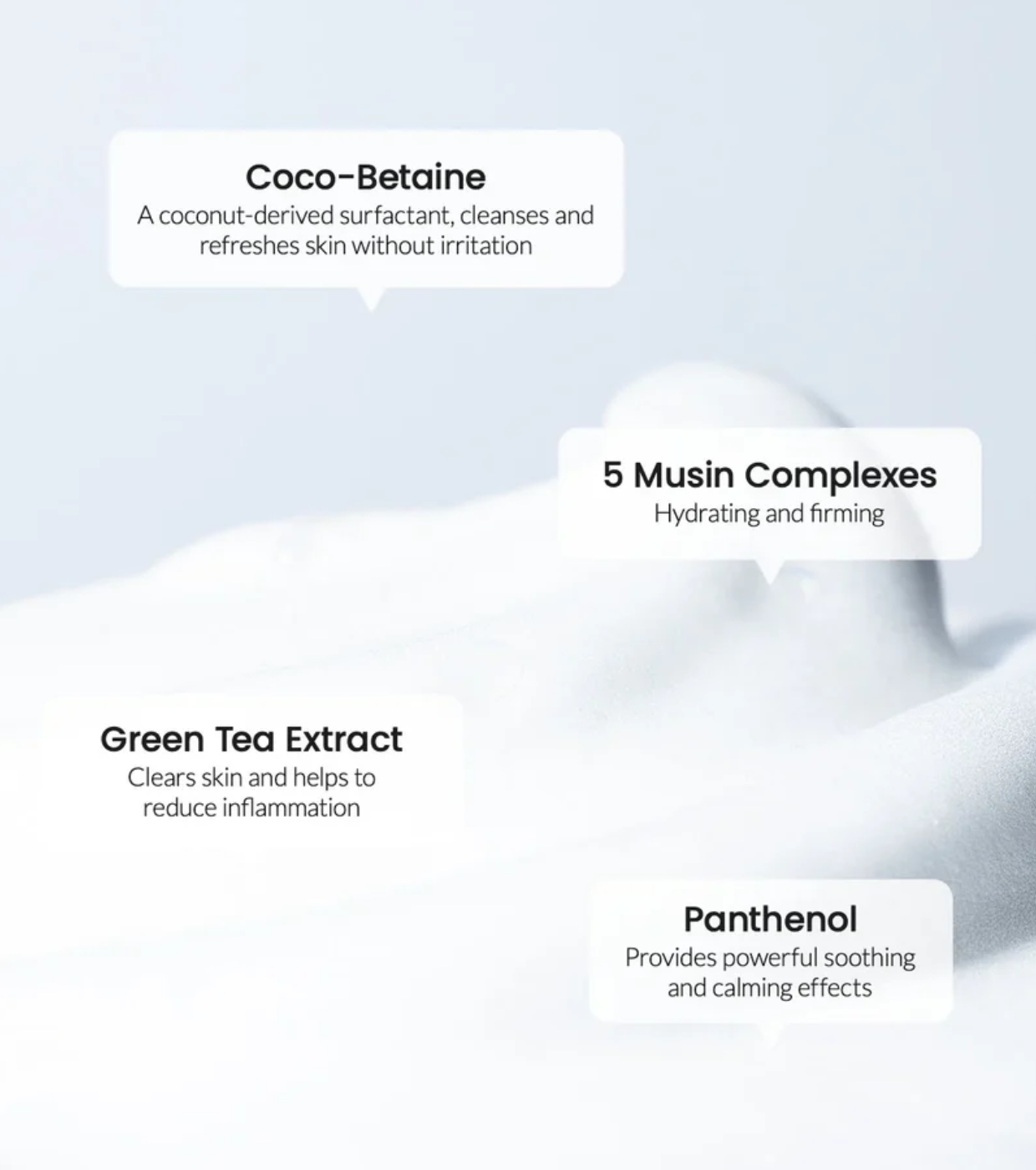 - Komplex aus 5 Mucinarten: verstärkt die Feuchtigkeitsversorgung, verbessert die Elastizität und lindert Reizungen.