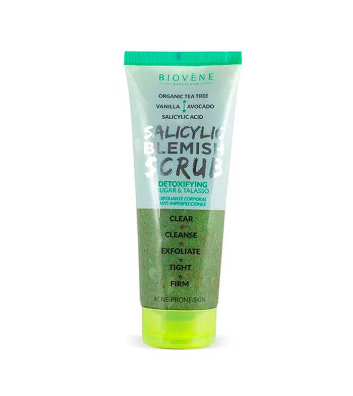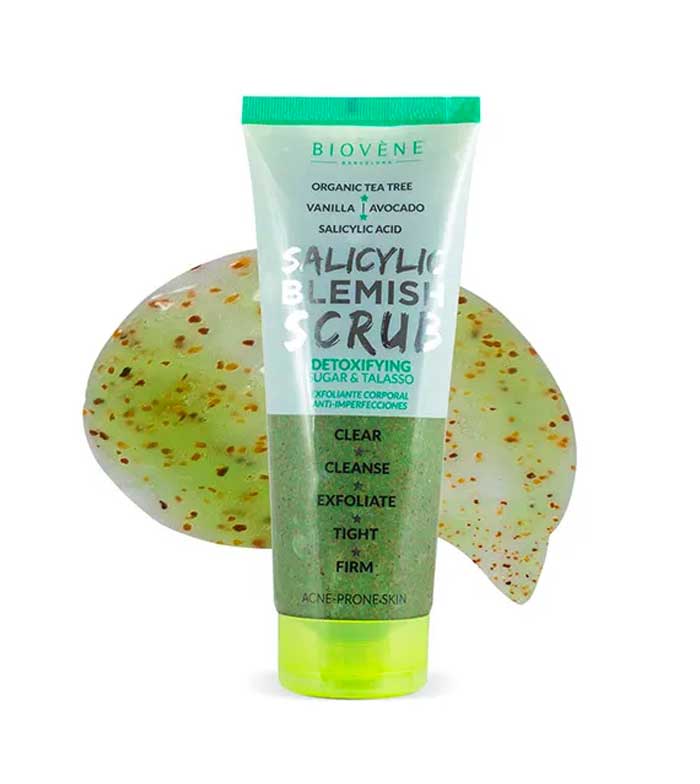 Biovène Detoxifying Body Scrub Salicylic Blemish zur Bekämpfung von Hautunreinheiten mit klärender Salicylsäure und Bio-Teebaum.