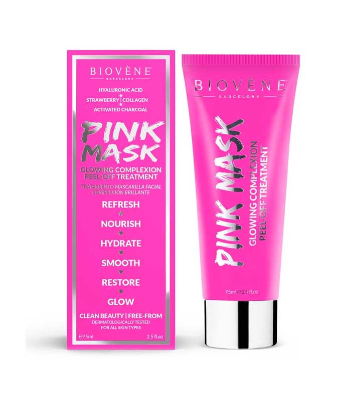 Reinigen und erfrischen Sie Ihre Haut mit der Aktivkohle-Peeling-Maske Glowing Complexion Pink Mask von Biovène.