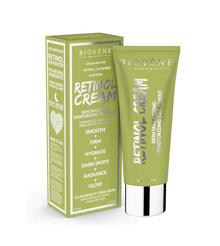 Retinol Cream di Biovène ist eine kraftvolle nächtliche Erneuerungsbehandlung mit erstklassigen Inhaltsstoffen wie Retinol, Aloe Vera, Gurke und Kakaobutter, um die Haut weich zu machen, zu hydratisieren und die Elastizität für einen strahlenderen Teint zu verbessern.