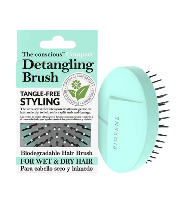 Entwirren Sie Ihr Haar sanft und schnell mit der biologisch abbaubaren kompakten Entwirrungsbürste The conscious von Biovène.