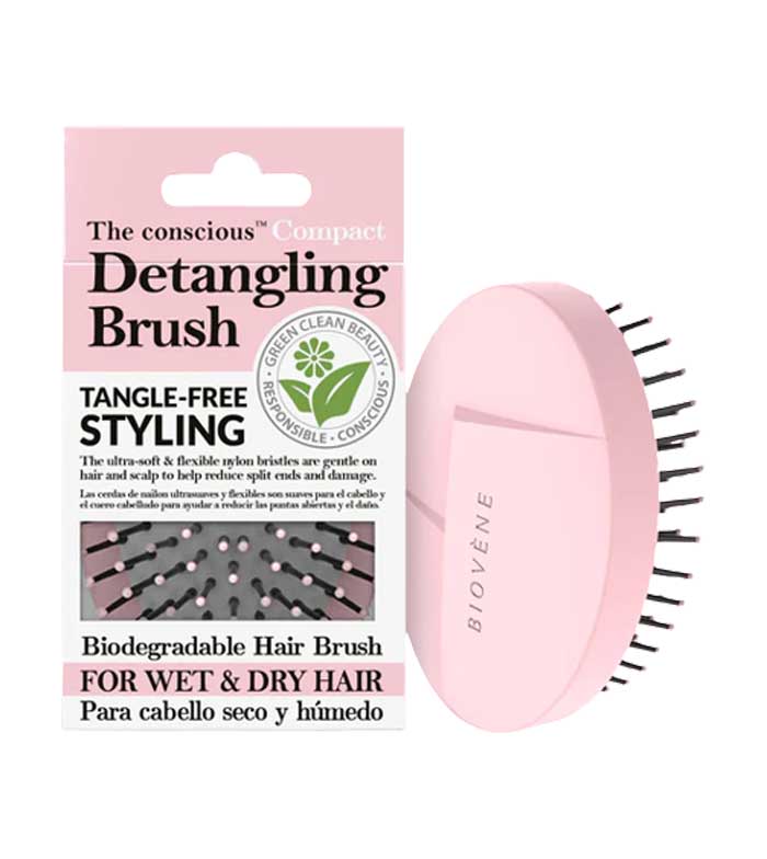 Entwirren Sie Ihr Haar sanft und schnell mit der biologisch abbaubaren kompakten Entwirrungsbürste The conscious von Biovène.