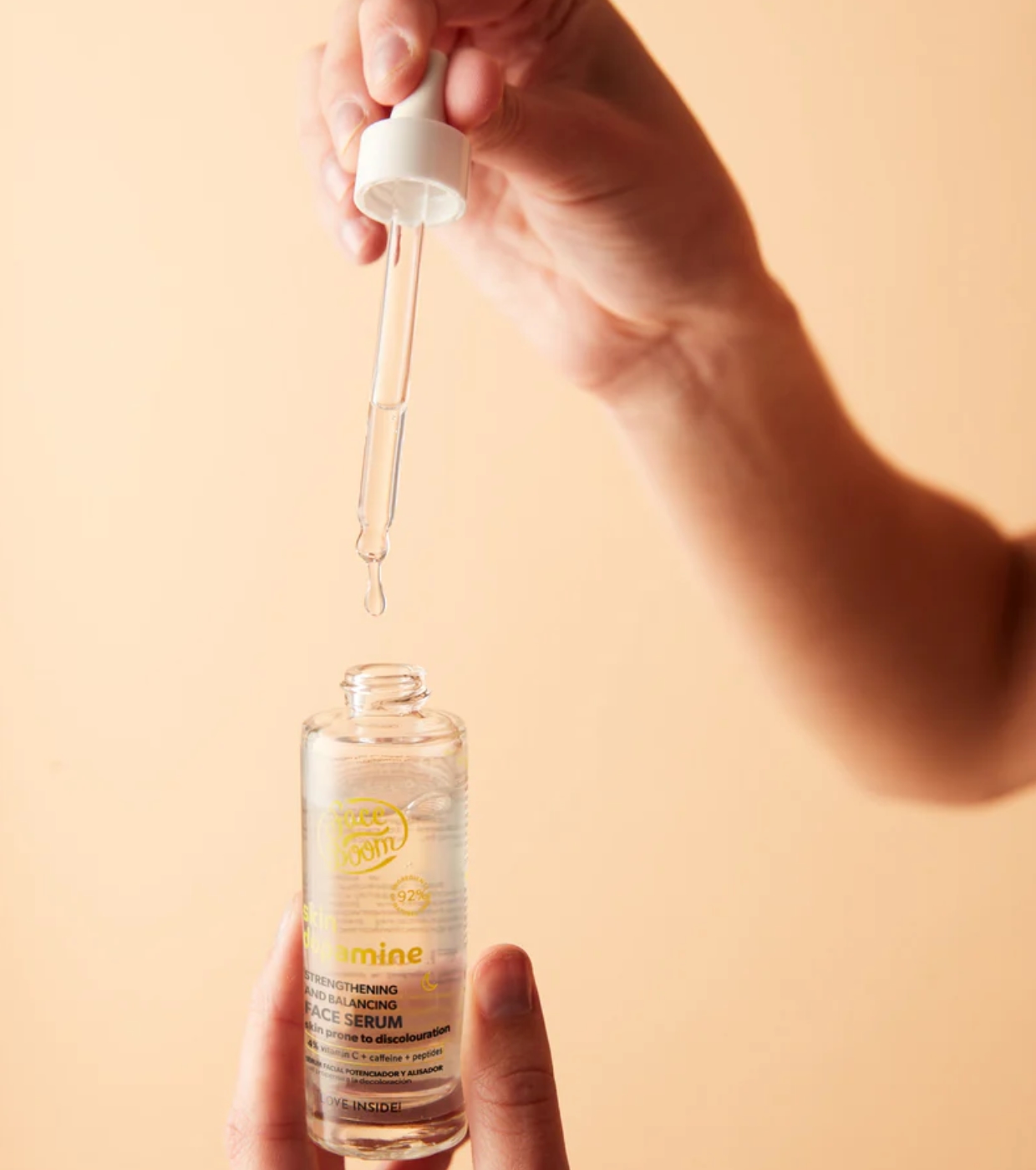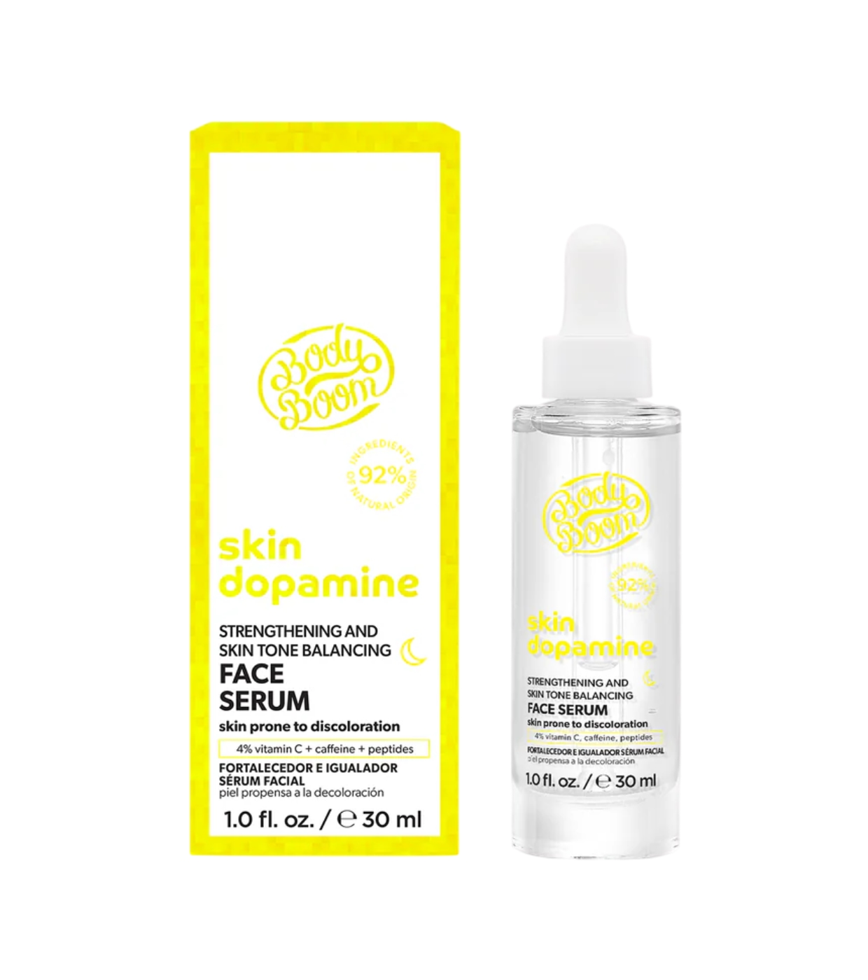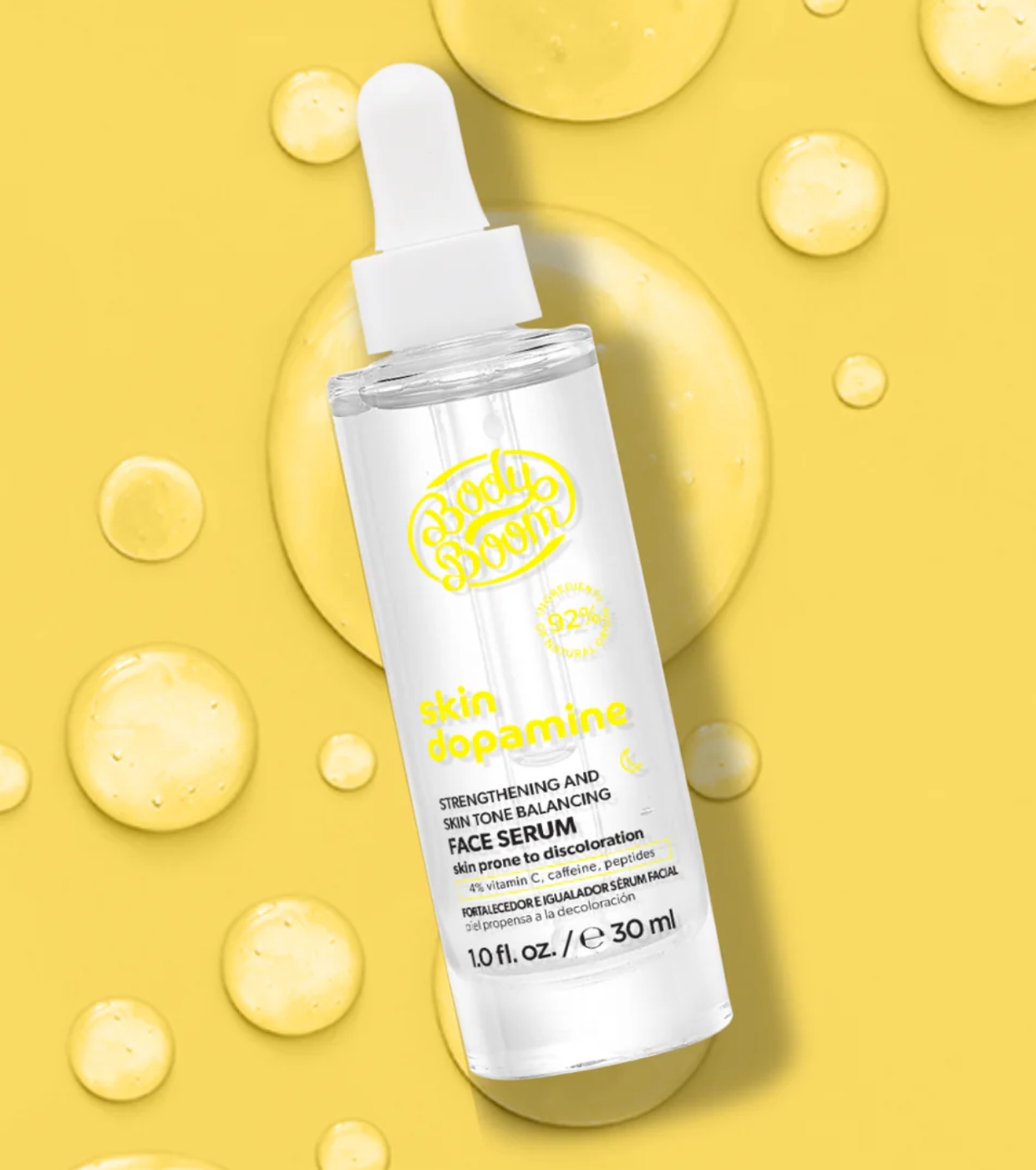 Verleihen Sie Ihrer Haut einen revitalisierenden Schub mit dem 4 % Vit C + Koffein + Peptide Strengthening and Unifying Serum von Bodyboom , einem veganen Serum, das Ihre morgendliche Pflegeroutine transformieren soll.