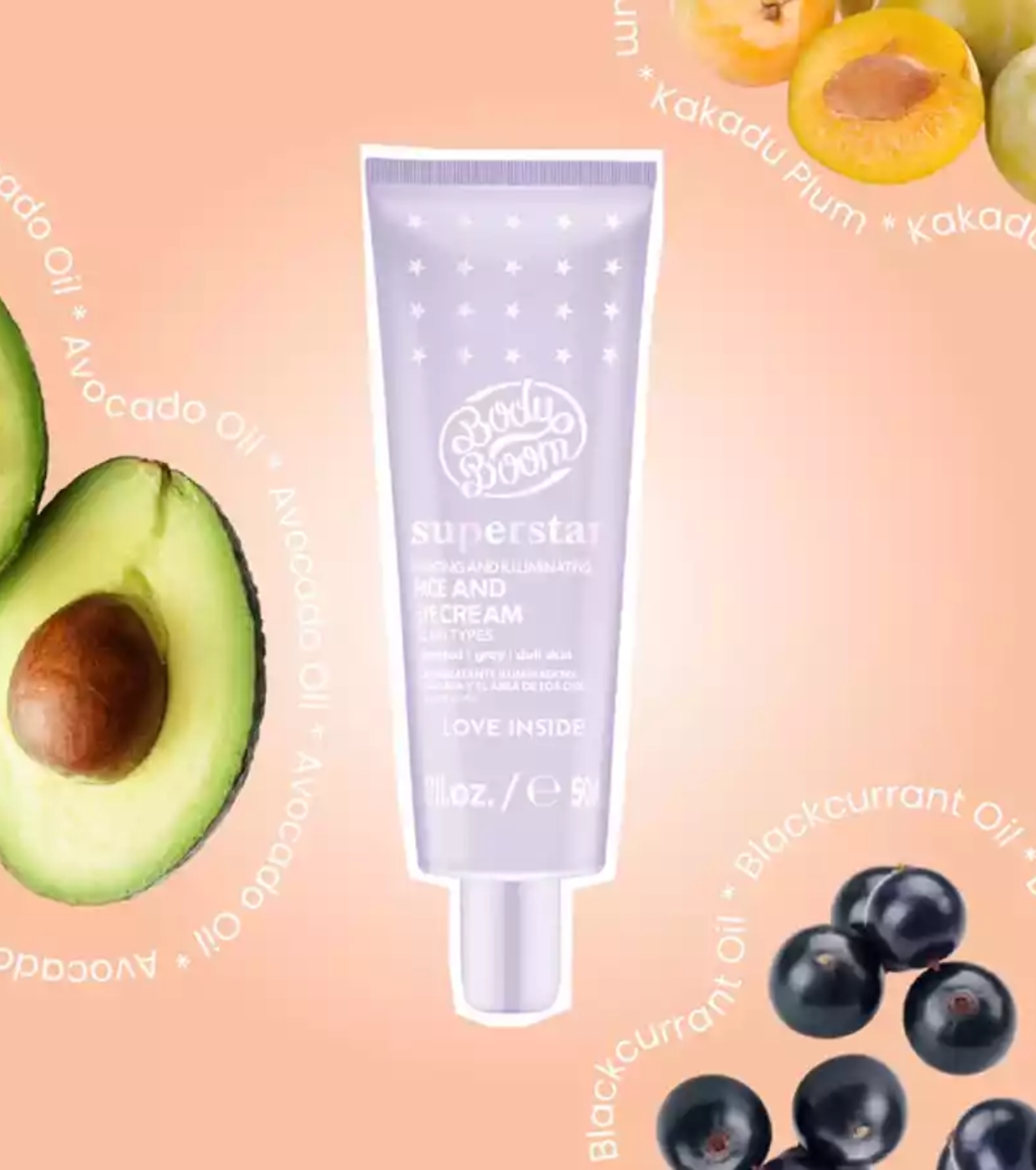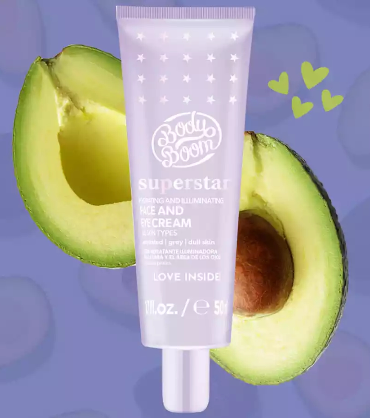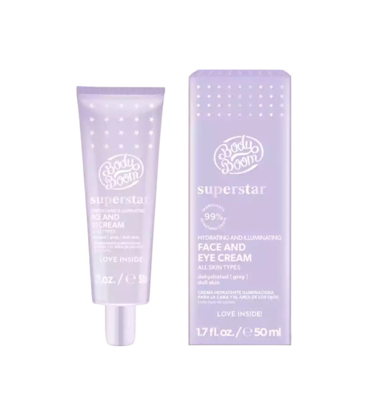 Geben Sie Ihrer Haut Energie mit der Superstar Face & Eye Cream von BodyBoom , einer 2-in-1-Creme, die sowohl dem Gesicht als auch der Augenpartie Feuchtigkeit spendet, sie zum Leuchten bringt und ihr Frische verleiht.