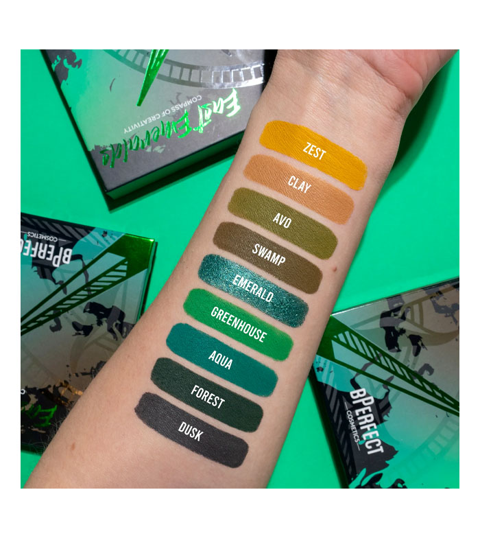 8 hochpigmentierte matte Farbtöne: Zest, Clay, Avo, Swamp, Greenhouse, Aqua, Forest, Dusk.