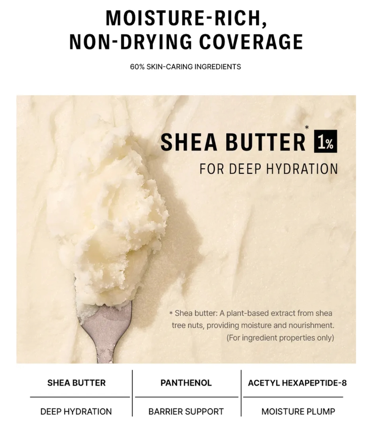 Dank seiner Formel mit 60 % feuchtigkeitsspendenden Inhaltsstoffen und 1 % Sheabutter bleibt die Haut weich, geschmeidig und fühlt sich nicht trocken an, selbst bei mattem Finish.