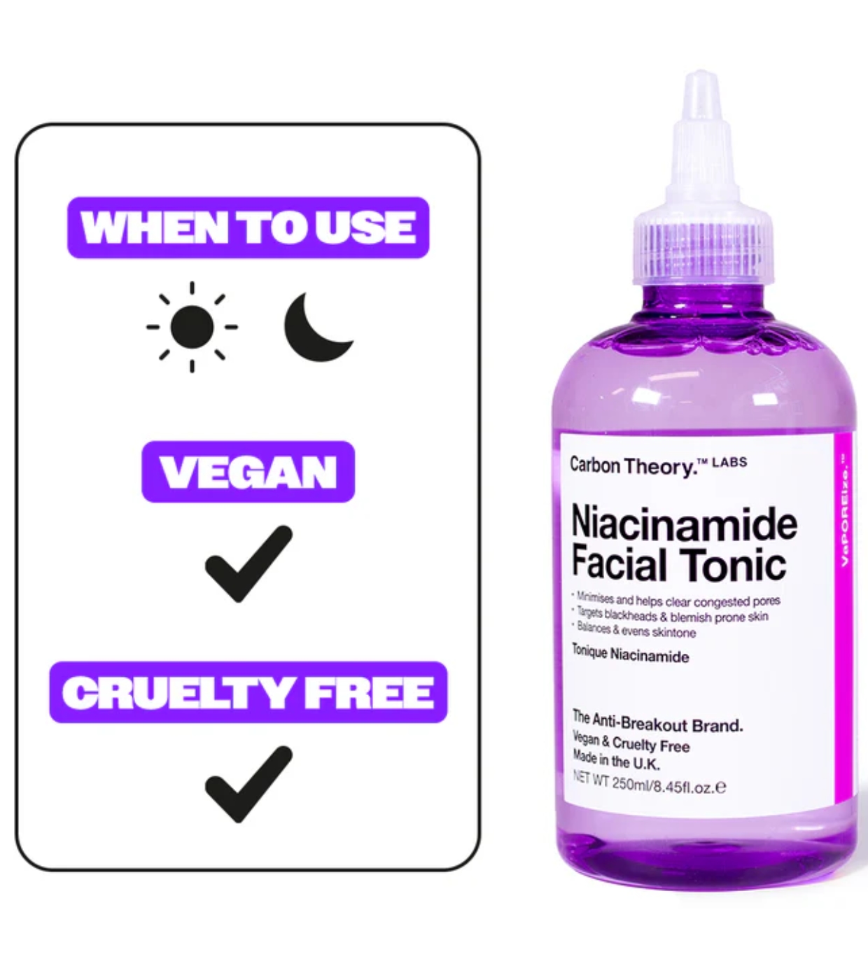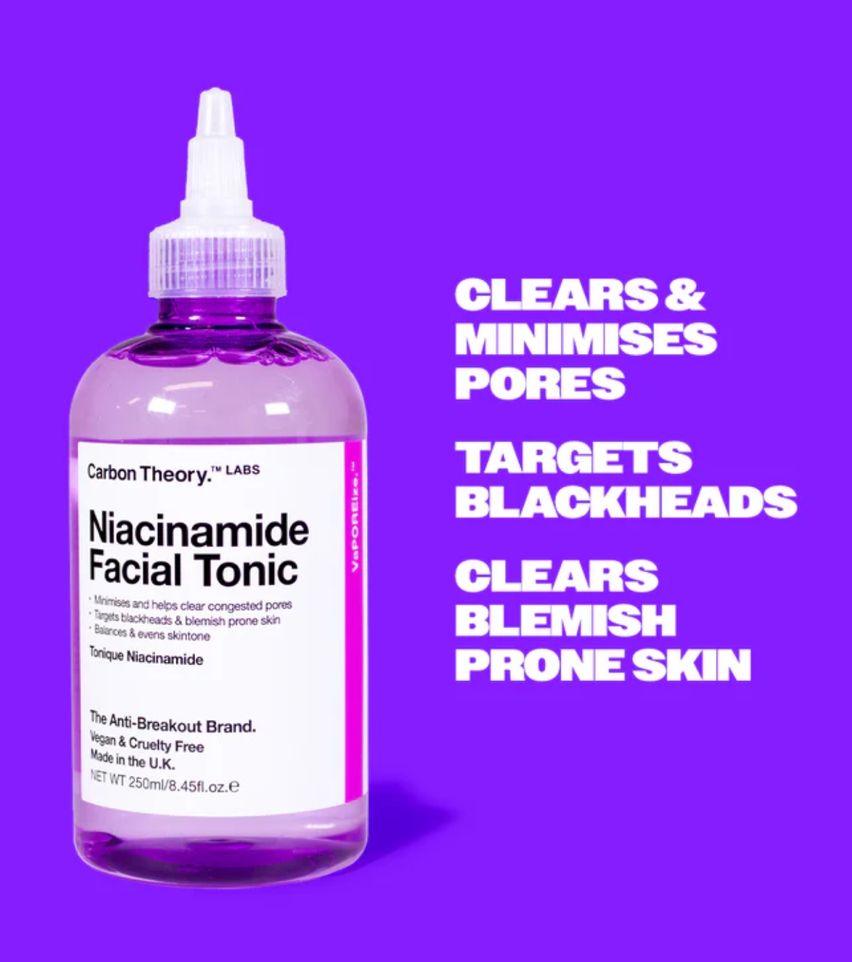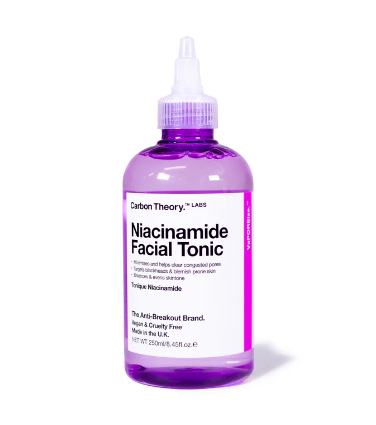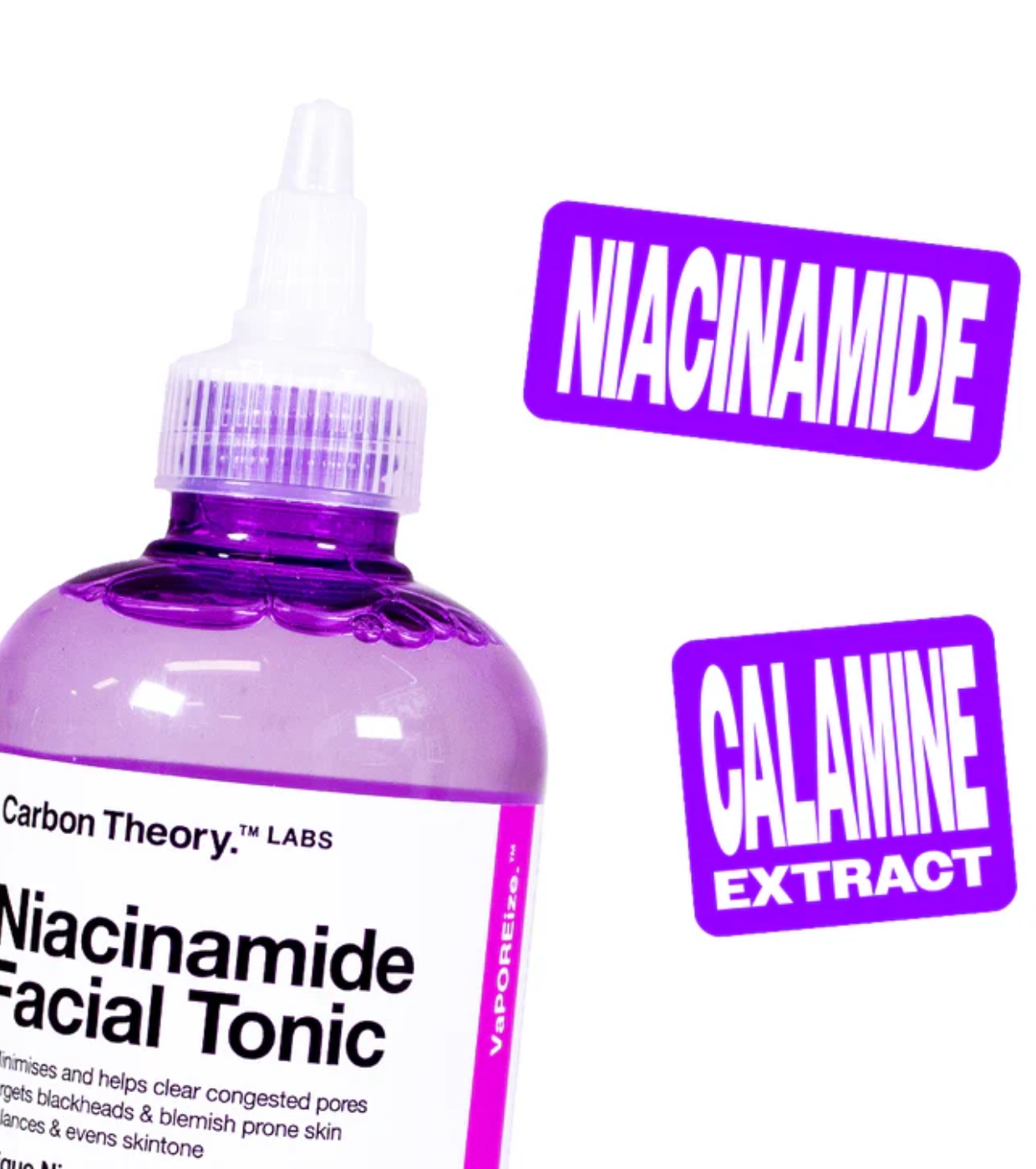 Carbon Theory Niacinamide Facial Toner ist die perfekte Lösung für zu Unreinheiten neigende Haut, da es tiefenwirksam reinigt, überschüssiges Öl reguliert und die Poren minimiert, ohne die Haut auszutrocknen oder ihre natürliche Barriere zu beeinträchtigen.