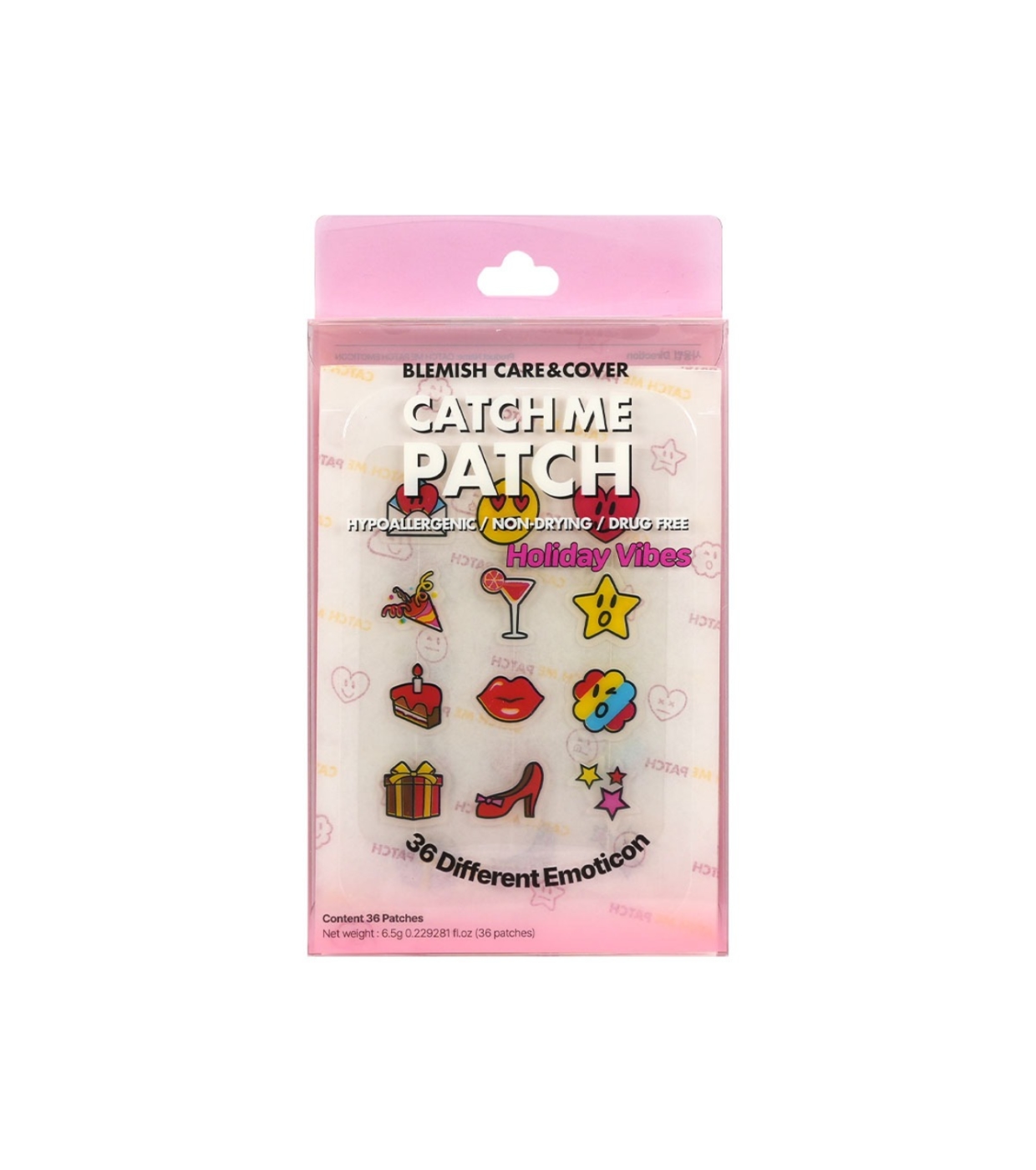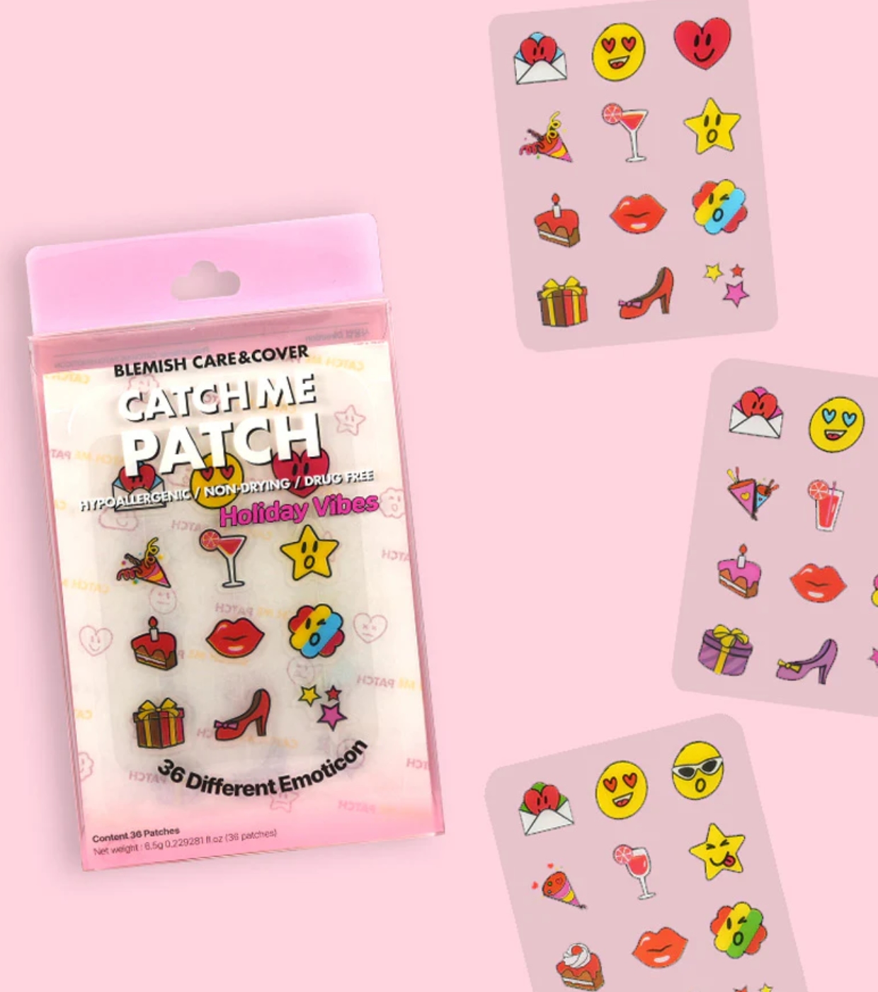 Holiday Vibes Pickelpflaster von Catch Me Patch , ein Hydrokolloidpflaster gegen Hautunreinheiten, das bei der Behandlung von Pickeln und kleinen Hautläsionen hilft und gleichzeitig die Haut schützt.