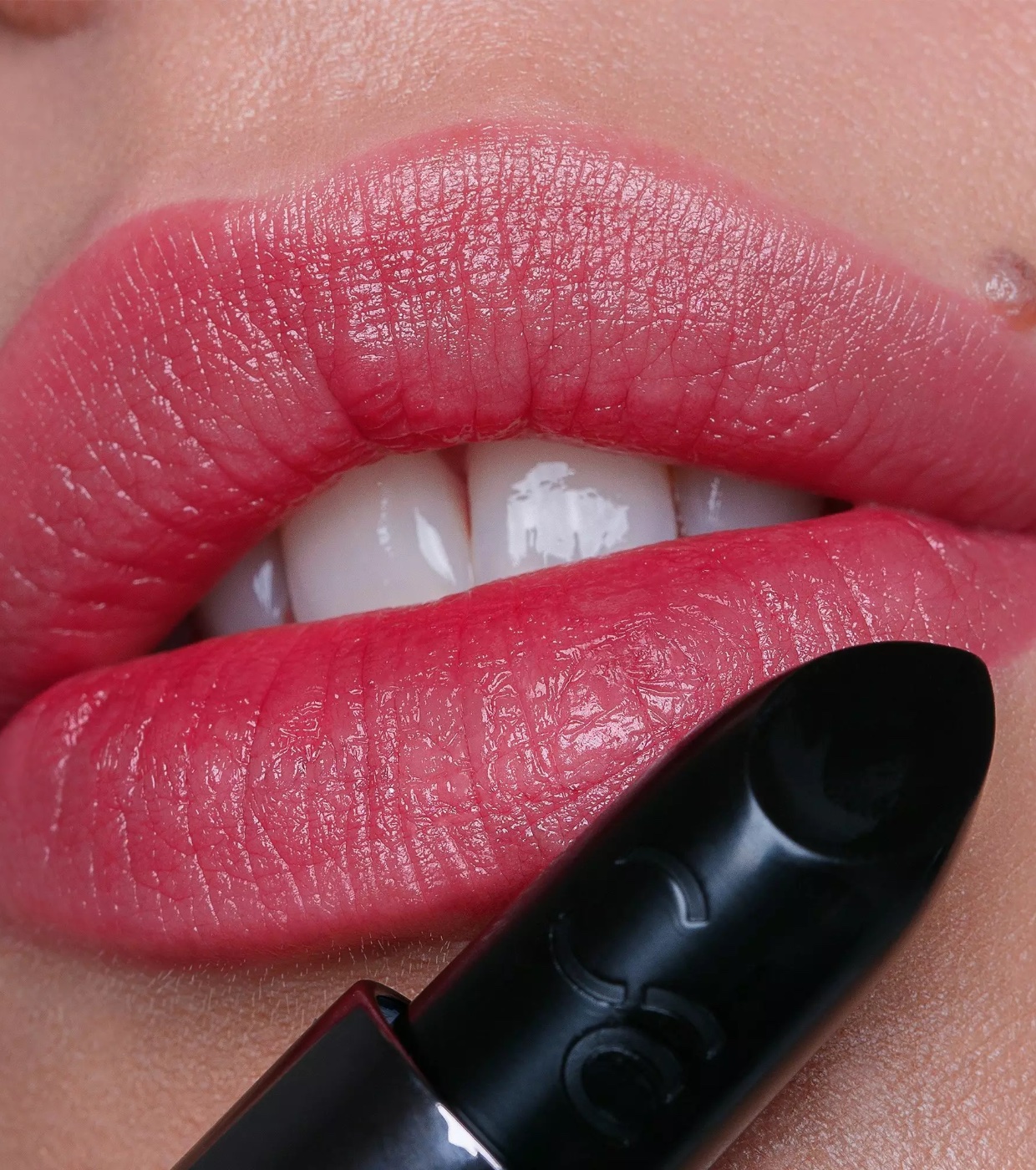 Seine innovative schwarze Textur reagiert auf den natürlichen pH-Wert Ihrer Lippen und verwandelt sich in ein intensives und schmeichelhaftes Dunkelrot.