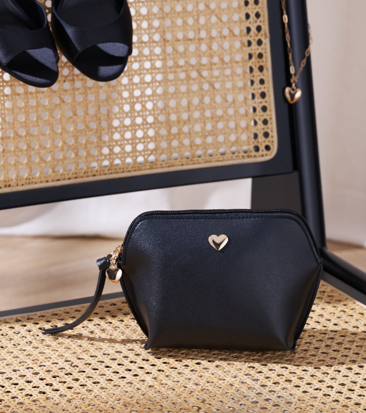 Die schwarze Lederoptik wird mit goldenen Details kombiniert, wie dem zarten Metallherz auf der Vorderseite und dem herzförmigen Griff, was dem Ganzen eine romantische und elegante Note verleiht.