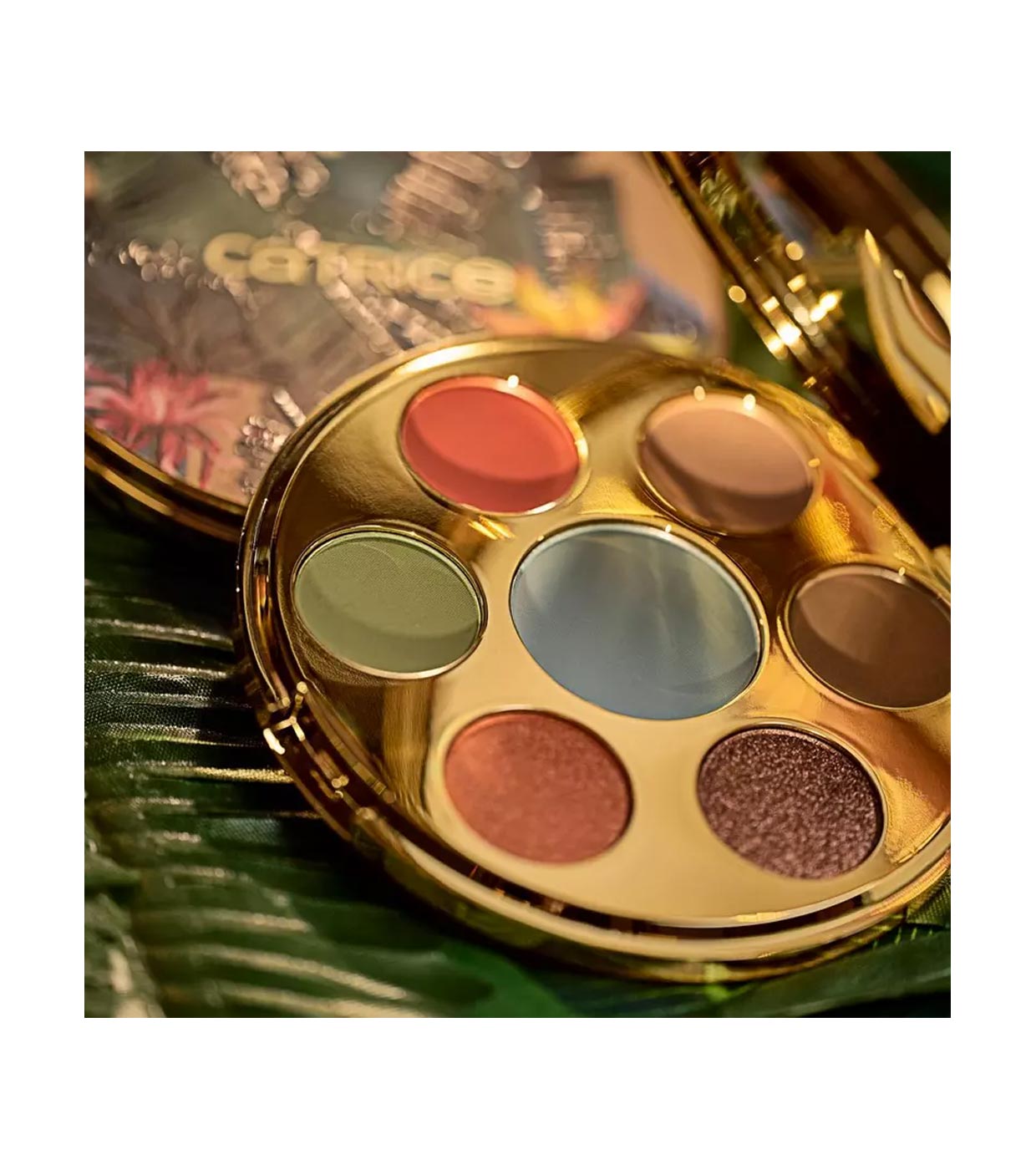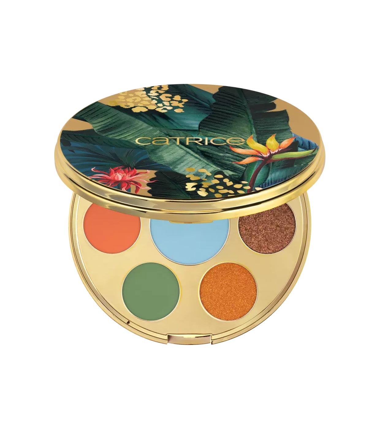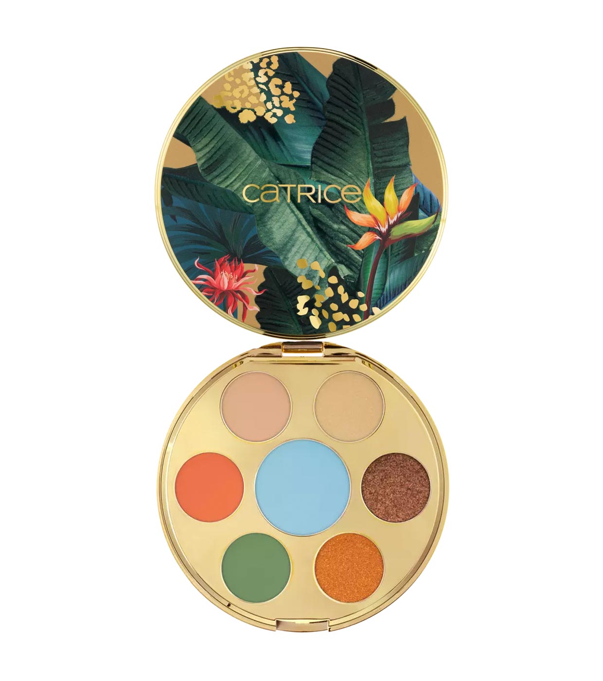 Diese Lidschattenpalette fällt durch ihr exotisches Design und den integrierten Spiegel auf: Grüne Palmenblätter, Goldapplikationen und exotische Blumen im Design erinnern an die tropische Natur.
