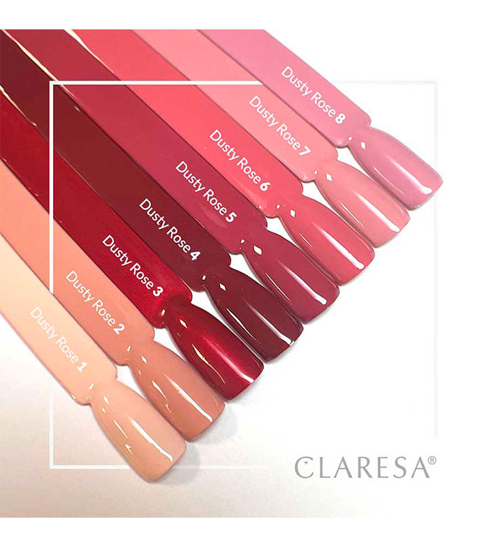 Die Dusty Rose-Kollektion von Claresa besteht aus 8 semi-permanenten Lacken in Rot-, Rosa- und Nudetönen, einige davon mit Metallic-Finish.